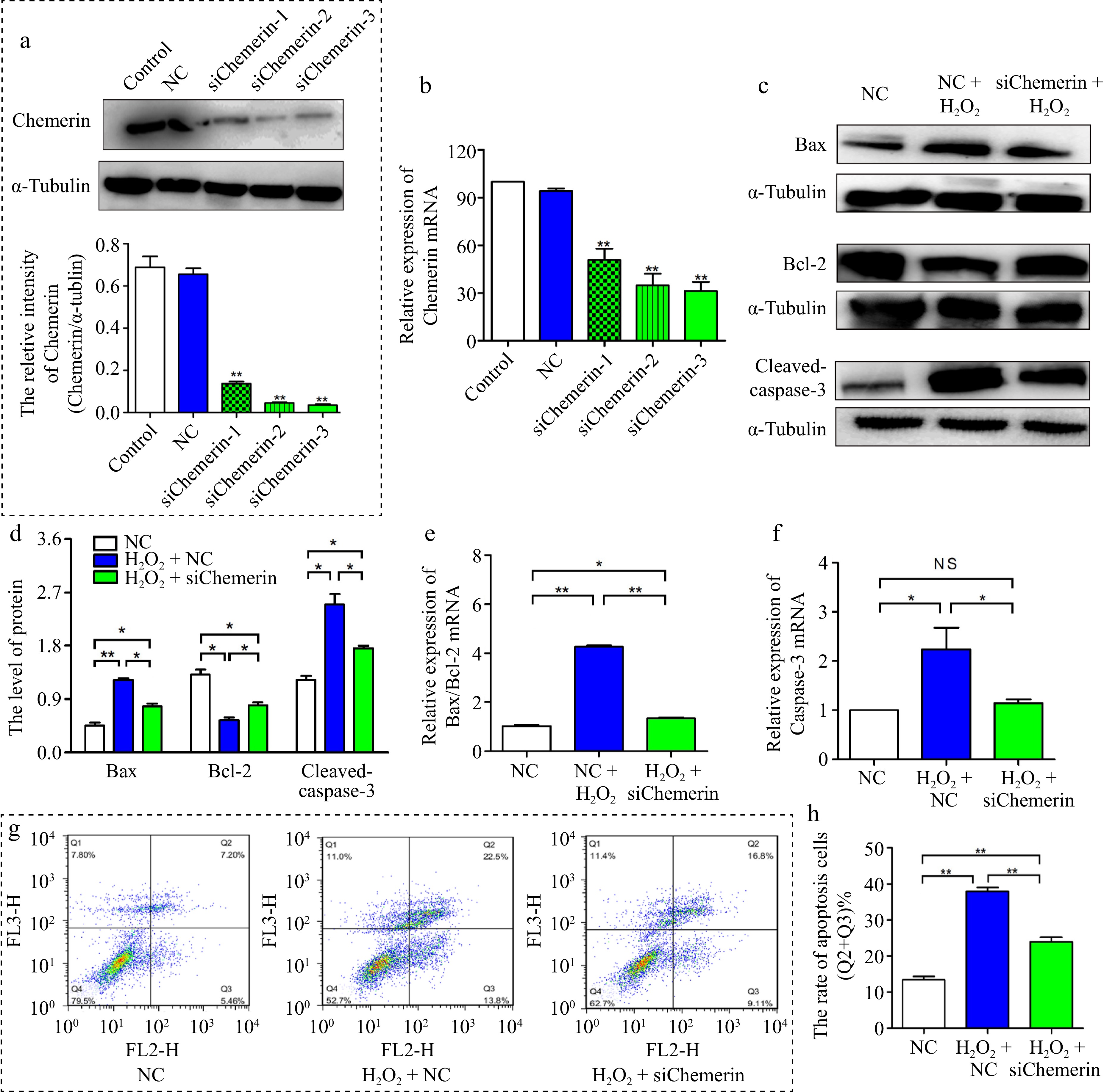 To further evaluate the effect of chemerin on apoptosis, we designed three small interfering RNAs of chemerin, and the interference efficiencies of si-chemerin-3 were more than 70%, so si-chemerin-3 was selected for subsequent study (Fig. 4a, b). As shown in Fig. 4c, d, compared with the H2O2 plus NC treatment, the pro-apoptotic proteins Bax and Cleaved-caspase-3 were down-regulated, and Bcl-2 was up-regulated under the si-chemerin plus H2O2 treatment. In agreement, si-chemerin plus H2O2 treatment remarkably decreased the mRNA expression of Bax/Bcl-2 and Caspase-3 (Fig. 4e, f). Flow cytometry results showed that si-chemerin significantly down-regulated H2O2-induced apoptosis (Fig. 4g, h). These results showed that chemerin gene silencing relieved the H2O2-induced apoptosis in BGCs.