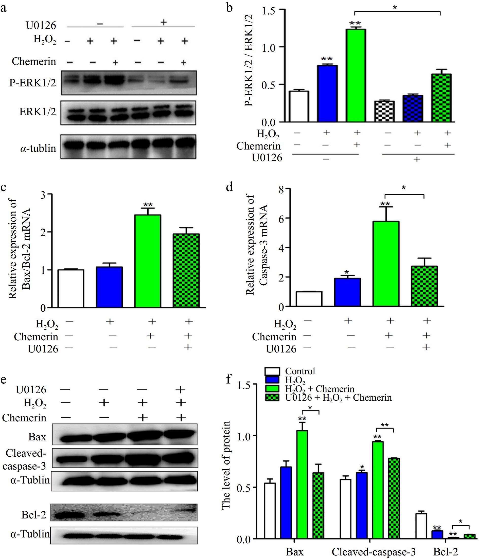 ERK1/2 signaling is essential in mediating apoptosis. As shown in Fig. 5a, b, chemerin promoted the level of p-ERK1/2 in contrast to H2O2 alone. To elucidate the role of ERK1/2 in chemerin-induced apoptosis, U0126, a selective ERK1/2 inhibitor, was chosen to block ERK1/2 signaling activity. The results demonstrated that U0126 pretreatment significantly inhibited ERK1/2 activation induced by chemerin (Fig. 5a, b). In addition, supplementation with U0126 decreased the mRNA expression of Caspase-3 and Bax/Bcl-2 ratio compared to H2O2 plus chemerin treatment (Fig. 5c, d). Consistently, increased Bax and Caspase-3 expression levels, along with reduced Bcl-2 expression levels, were observed in the H2O2 plus chemerin-treated group, whereas U0126 treatment reversed these protein expression patterns (Fig. 5e, f). These results suggest that the ERK1/2 pathway is involved in chemerin-induced apoptosis.