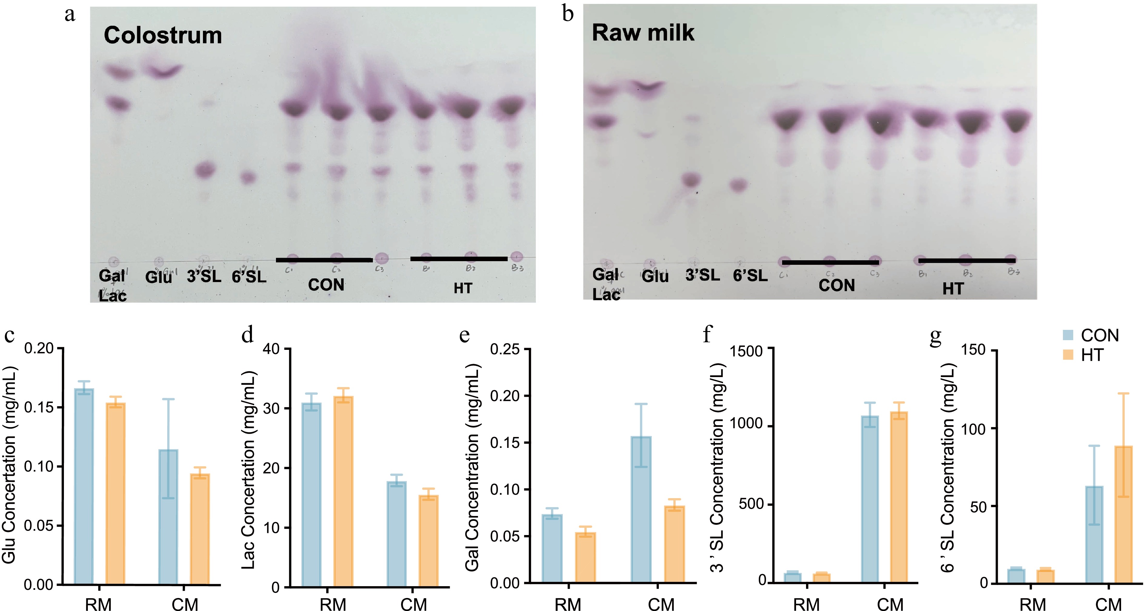 The impact of pasteurization on key carbohydrates in milk. (a), (b) Results of TLC of key carbohydrates in raw milk and colostrum. (c)–(g) Carbohydrate content of raw milk and colostrum (p > 0.05). RM, raw milk; CM, colostrum; CON, control group; HT, pasteurization group.