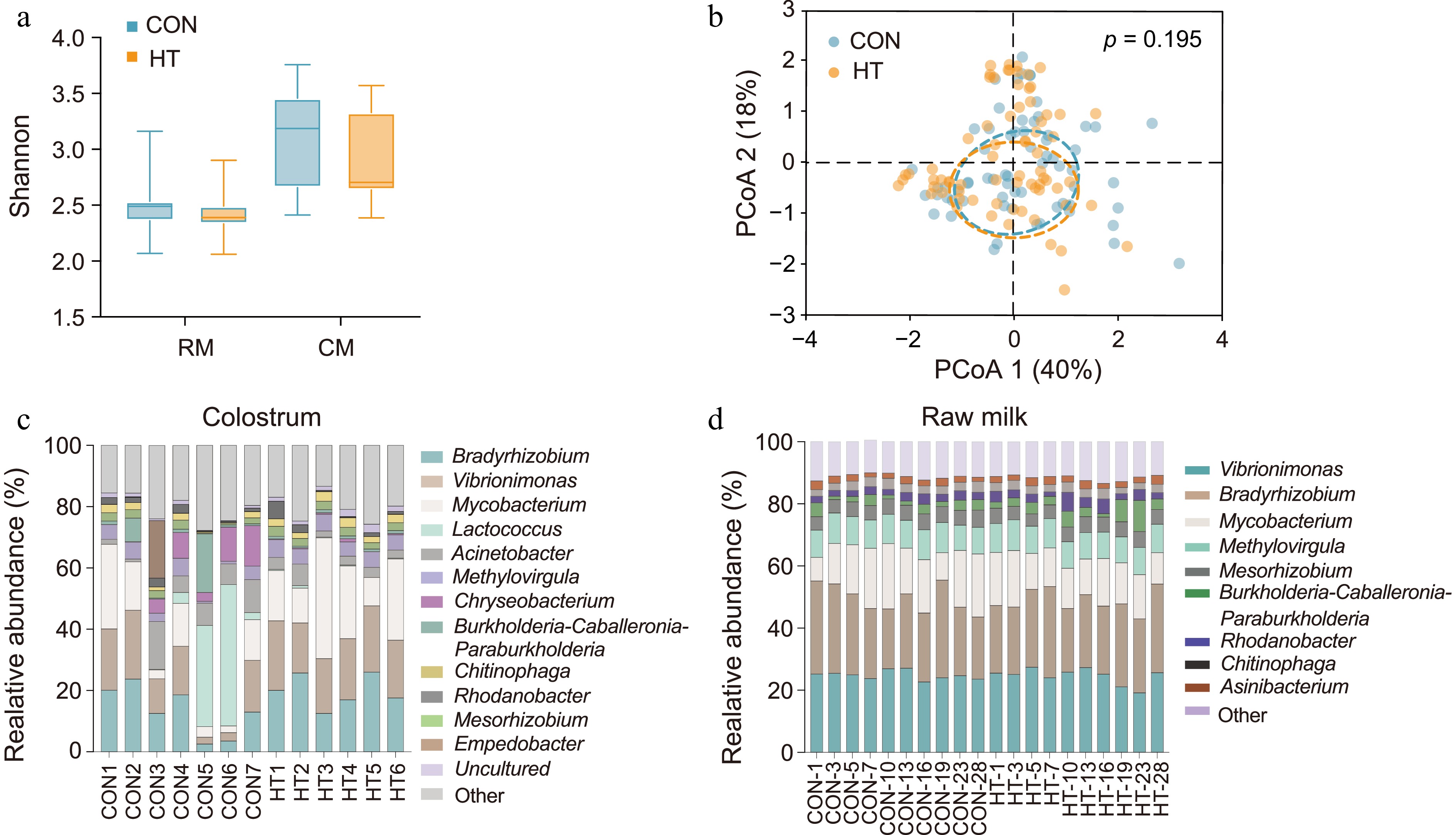 • To examine the primary factors influencing variations in microbial colonization, a 16S rRNA sequencing analysis was conducted on colostrum and milk samples. Alpha diversity of colostrum and raw milk microbes did not vary significantly between the HT and CON groups (Fig. 4a). However, colostrum displayed higher diversity in microbial composition than raw milk (Fig. 4a). Beta-diversity analysis showed that the microbial structure had no significant differences between the two groups (Fig. 4b). Proteobacteria, Bacteroides, Firmicutes, and Actinobacteria as the four most abundant phyla in both colostrum and raw milk (Supplementary Fig. S2a, b). The core and abundant genera in colostrum included Bradyrhizobium, Vibrionimonas, Mycobacterium, and Lactococcus (Fig. 4c). At the genus level, the bacterial flora of cow's milk is mainly composed of Vibrionimonas, Bradyrhizobium, Mycobacterium, Methylovirgula, Mesorhizobium, Burkholderia-Caballeronia-Paraburkholderia, and Rhodanobacter, accounting for more than 80% of the total bacteria (Fig. 4d).