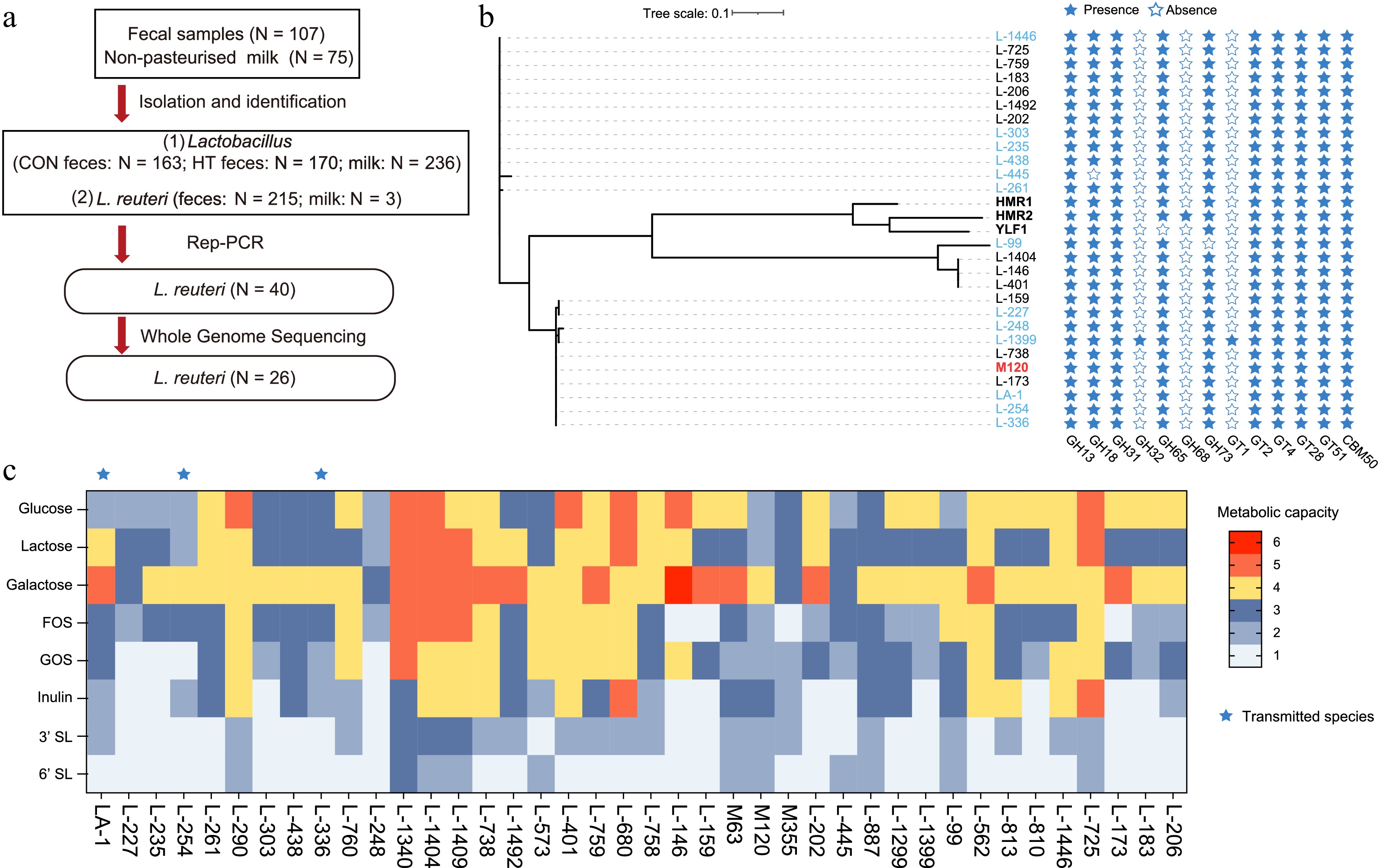 Results of Lactobacillus isolation and identification. (a) Processes for strain screening and identification. (b) Phylogenetic analysis and the predicted glycosyl hydrolases in L. reuteri. Phylogenetic supertree showing the relationship in 29 L. reuteri strains. HMR1 and HMR2 are human-derived L. reuteri strains. YLF1 is a Yak-derived L. reuteri strain. Strains isolated from milk are marked in red. Strains isolated from CON group feces are marked in blue. Strains isolated from HT group feces are marked in black. (c) The metabolic capacity of L. reuteri for different carbon sources.