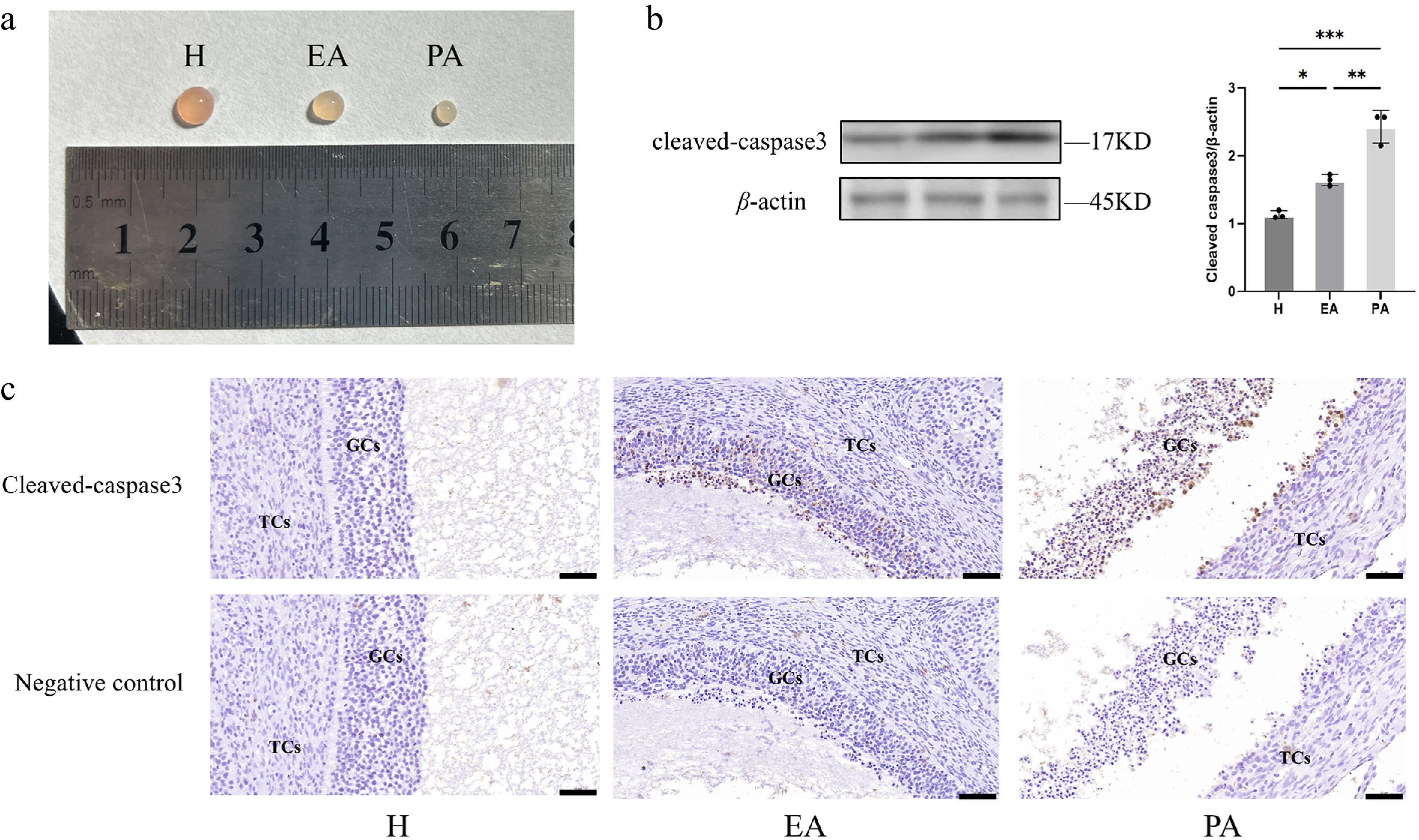 • Follicles were classified into three distinct atresia stages, namely healthy (H), early atretic (EA), and progressively atretic (PA), according to established morphological criteria (Fig. 1a)[37]. Apoptotic activity in the GCs across follicular categories was assessed through Cleaved Caspase-3 detection via immunohistochemistry (IHC) and Western blotting. As shown in Fig. 1b, the expression of Cleaved Caspase-3 was significantly increased in EA and PA follicles compared with the H group. In addition, the IHC results showed that the expression of Cleaved Caspase-3 in paraffin sections increased with follicular atresia (Fig. 1c). All these results suggested that GC apoptosis was associated with follicular atresia, and demonstrated the reliability of our classification for further experiments.