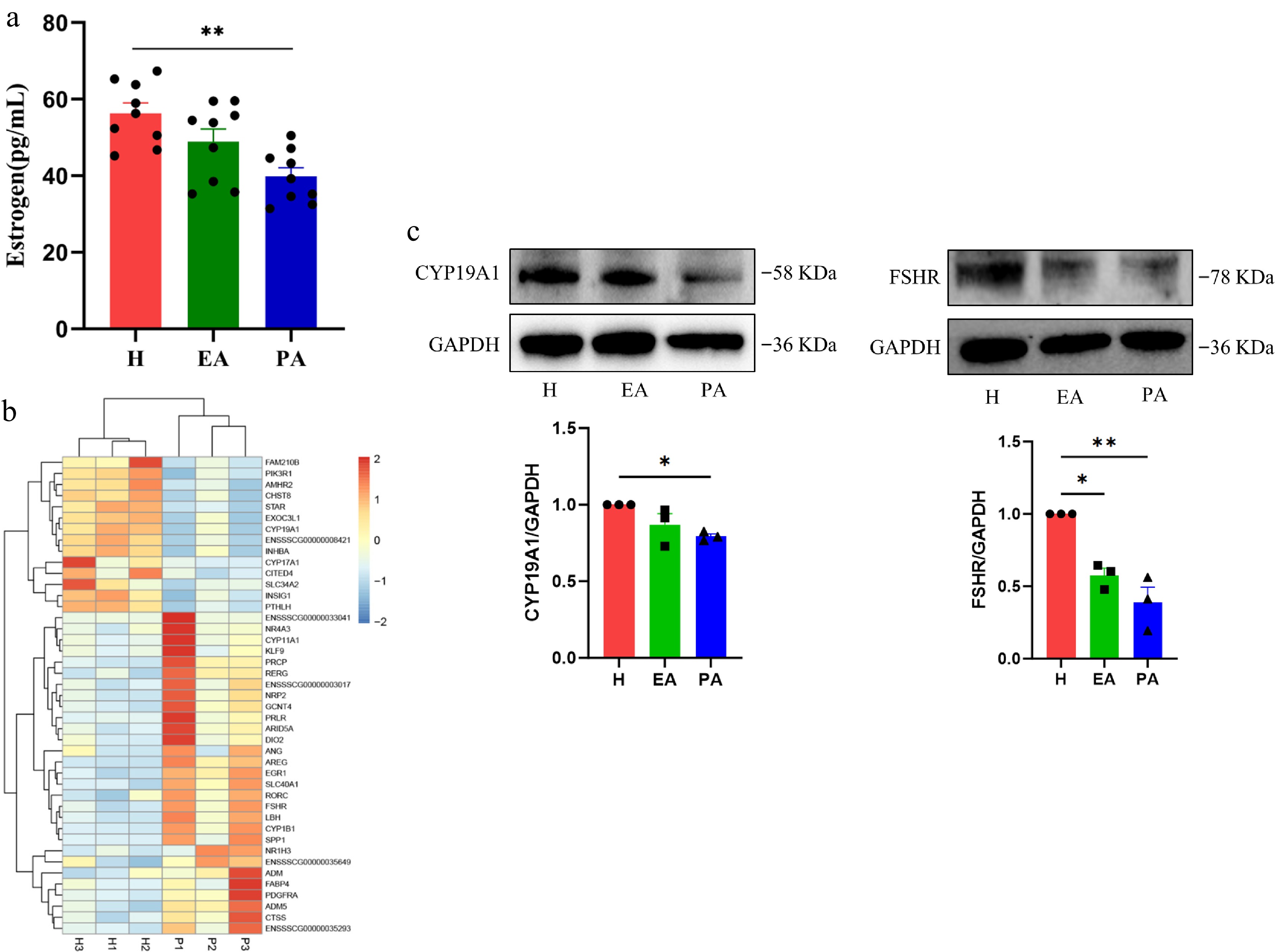 Estrogen secretion levels in different types of follicles and the expression of hormone secretion-related genes and proteins in granulosa cells. (a) ELISA for estrogen in the follicular fluid of H, EA, and PA. (b) Heatmap of hormone secretion-related genes in granulosa cells of H and PA. Blue, downregulated genes; red, upregulated genes. (c) Western blotting analysis of hormone secretion-related proteins in granulosa cells from H, EA, and PA. H, healthy follicles; EA, early atretic follicles; PA, progressively atretic follicles. Data are represented as the mean ± SEM. * p < 0.05, ** p < 0.01.