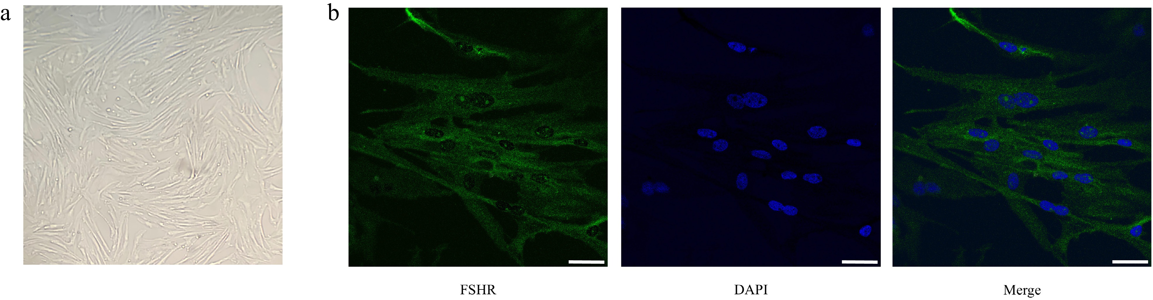 Morphological observation and purity identification of porcine follicular granulosa cells. (a) Observation of granulosa cells' morphology by inverted microscopy. (b) Immunofluorescence staining of FSHR. From left to right: FSHR fluorescence staining (green); nuclear DAPI staining (blue); merged image. Scale bar, 20 μm.
