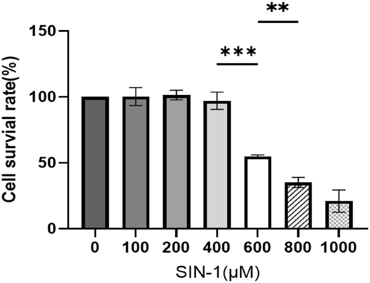 Cell survival rate of SIN-1-treated granulosa cells. Viability assessment via a CCK-8 assay following 24 h of exposure to SIN-1. Data are presented as the mean ± SEM. ** p < 0.01, *** p < 0.001.