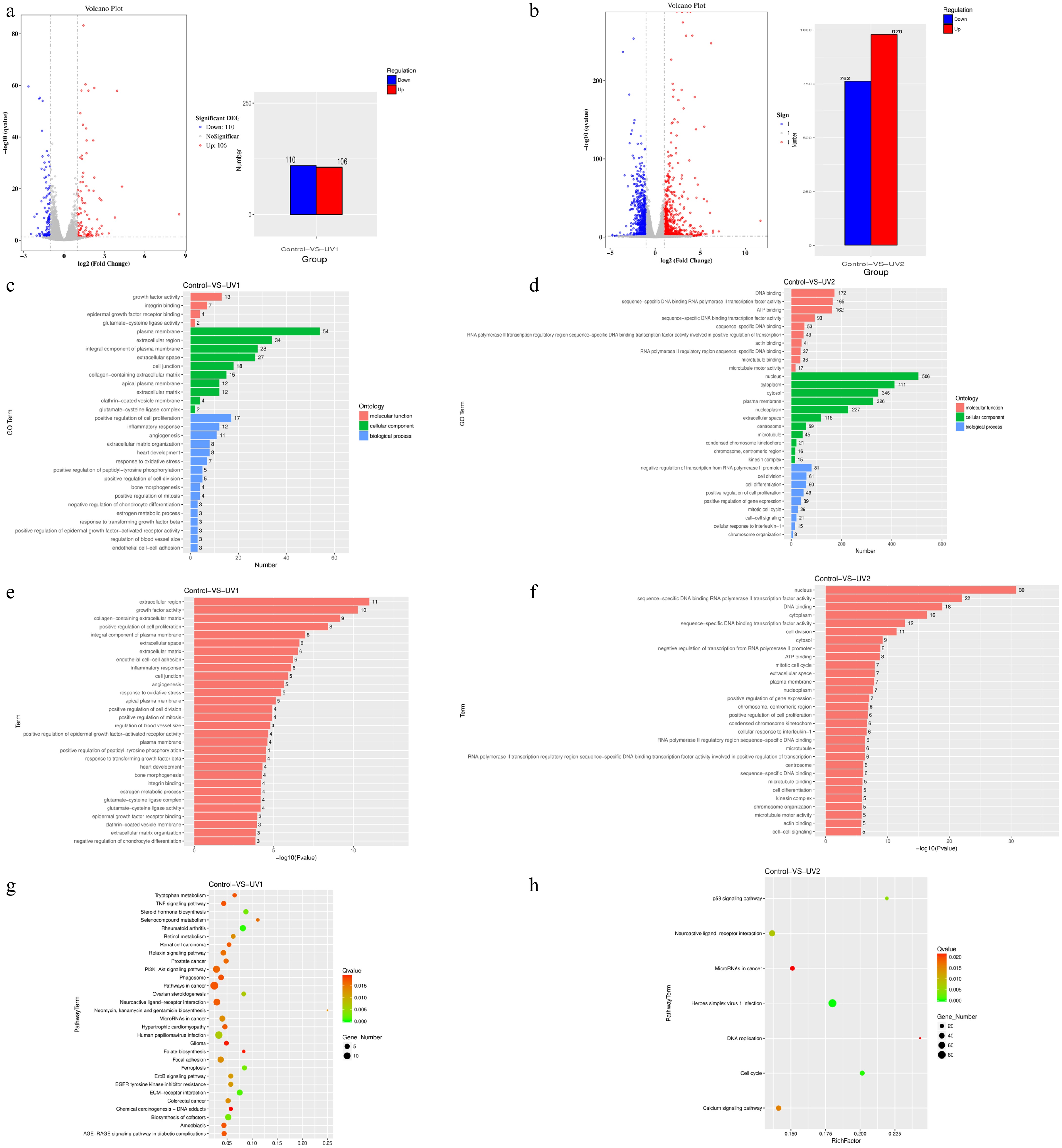 Number of differentially expressed genes, and GO enrichment and KEGG enrichment of differentially expressed genes in each group after SIN-1 treatment. (a) Volcano plot and bar graph of the DEGs of the 400 μM SIN-1-treated and control groups. The bar graph shows that of all 216 DEGs, 110 of them were downregulated and 106 were upregulated. (b) Volcano plot and bar graph of the DEGs of the 800 μM SIN-1-treated and control groups. The bar graph shows that of all 1741 DEGs, 762 of them were downregulated and 979 were upregulated. For the visualization of the DEGs in the volcano plots. The horizontal coordinate is the fold change in expression in the control and SIN-1-treated groups, and the vertical coordinate is the statistical significance of the change in expression. Different colors indicate different classifications: blue (downregulation), red (upregulation), and gray (no significant difference). (c, d) GO enrichment analysis of DEGs in the control, 400 μM SIN-1-treated, and 800 μM SIN-1-treated groups. The vertical coordinate is the enriched GO term, and the horizontal coordinate is the number of DEGs in that term. Different colors are used to distinguish different enriched terms: blue (biological processes), green (cellular components), and red (molecular functions). (e, f) Statistical significance profiles of GO terms. The vertical coordinate is the enriched GO term and the horizontal coordinate is the p-value. (g, h) KEGG enrichment analysis of DEGs in the control, 400 μM SIN-1-treated, and 800 μM SIN-1-treated groups. The vertical coordinate indicates the name of the pathway, the horizontal coordinate indicates the enrichment factor, the dot size correlates with the quantity of DEGs, the color gradient indicates the q-value significance. Control, 0 μM SIN-1-treated group; UV1, 400 μM SIN-1-treated group; UV2, 800 μM SIN-1-treated group.