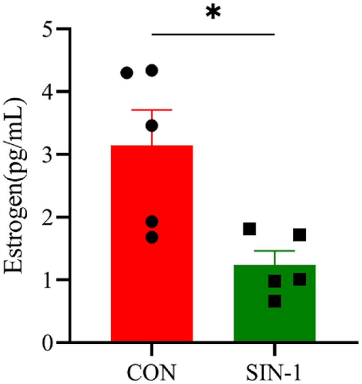 Hormone secretion levels in SIN-1-treated granulosa cells. Estrogen levels in the cell supernatants tested with an ELISA kit. CON, 0 μM SIN-1-treated group; SIN-1, 400 μM SIN-1 treatment group. Data are presented as the mean ± SEM. * p < 0.05, ** p < 0.01.