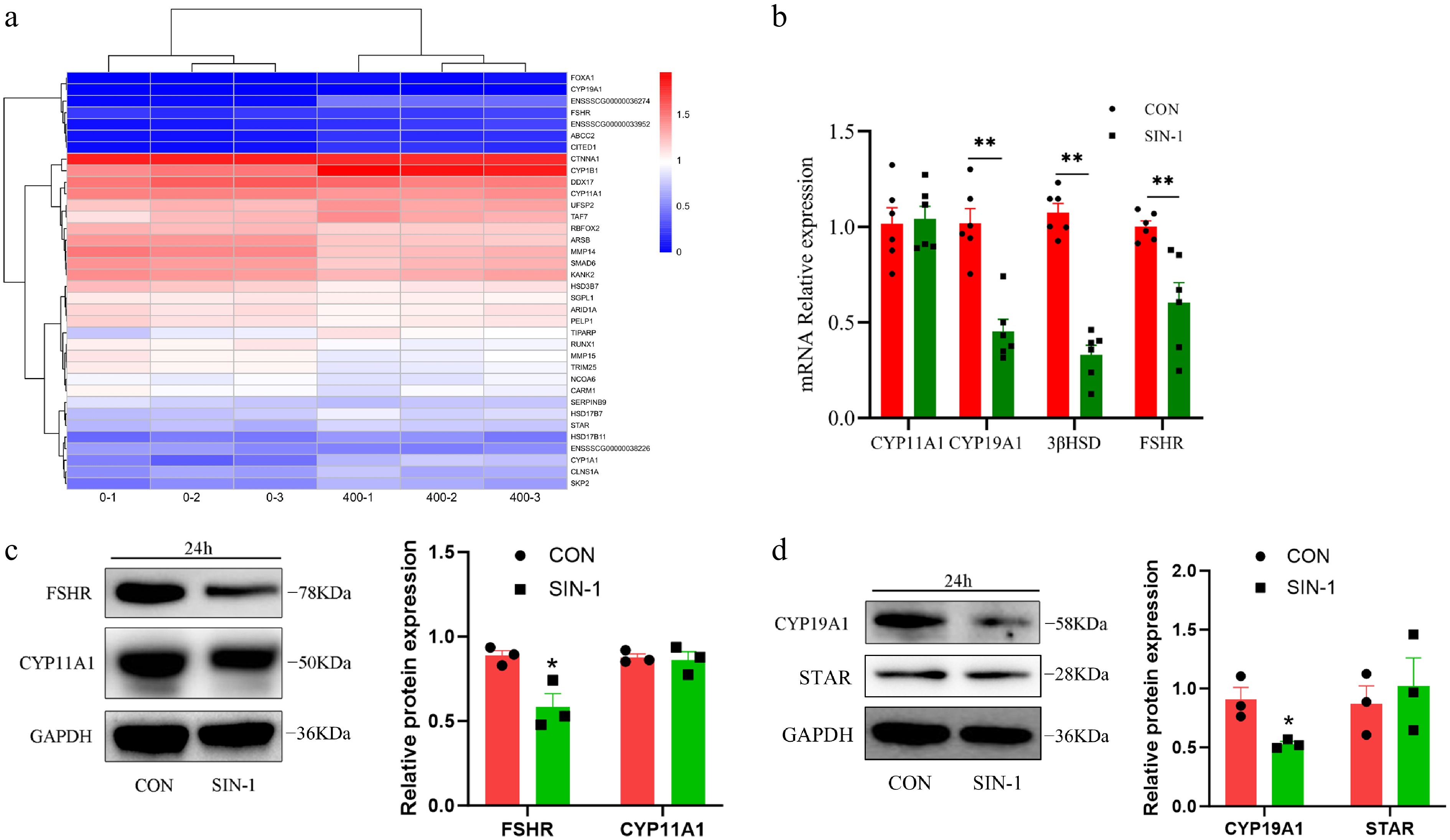 Expression of hormone secretion-related genes and proteins in granulosa cells. (a) Heatmap of hormone secretion-related DEGs; 0-1, 0-2, and 0-3 are the control groups, whereas 400-1, 400-2, and 400-3 are the 400 μM SIN-1 treatment groups. Blue, downregulated genes; red, upregulated genes. (b) RT-PCR analysis of the relative expression of the mRNA of hormone secretion-related genes in granulosa cells. (c, d) Western blot analysis of hormone secretion-related proteins in granulosa cells. CON, control group; SIN-1, 400 μM SIN-1-treated group. Data are presented as the mean ± SEM. * p < 0.05, ** p < 0.01.