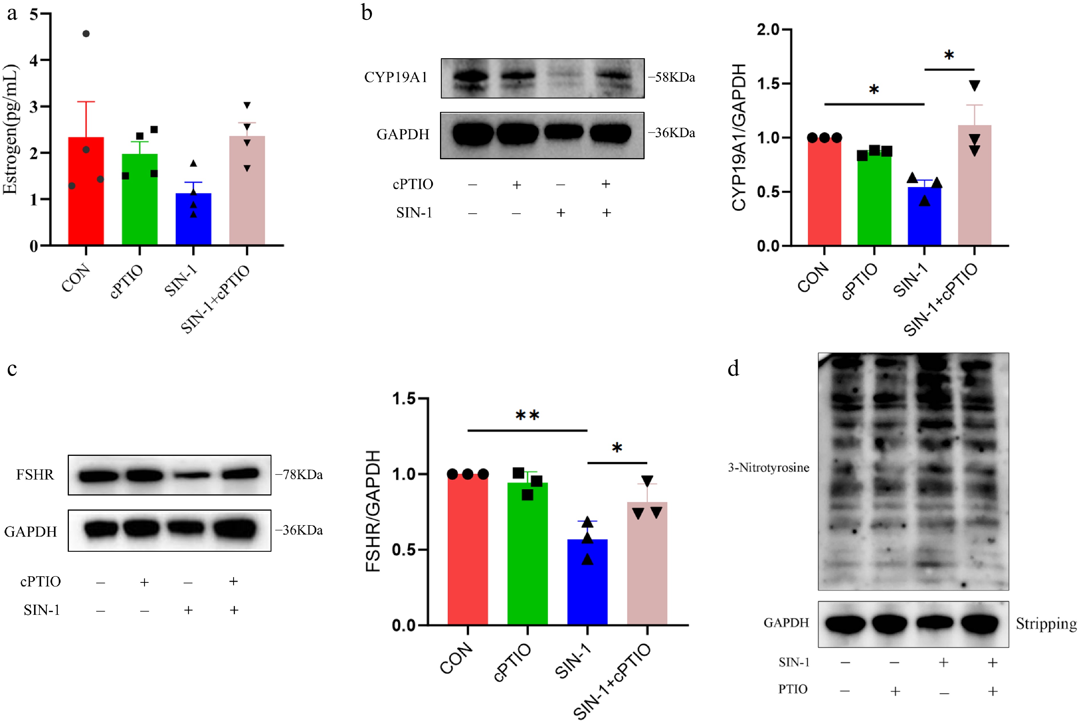 • To confirm the specificity of ONOO in disrupting GC steroidogenesis, cells were co-treated with SIN-1 (400 μM) and the NO scavenger cPTIO (100 μM). ELISA analysis demonstrated partial rescue of E2 secretion in the cPTIO+SIN-1 groups compared with SIN-1 alone (Fig. 8a). Western blot quantification demonstrated that cPTIO significantly alleviated SIN-1-induced suppression of CYP19A1 and FSHR expression (Fig. 8, c). Given the nitrating activity of OONO, the tyrosine nitration levels in GCs were further evaluated. The results showed that the tyrosine nitration level of GCs was significantly increased after SIN-1 treatment, but the addition of cPITO inhibited this change (Fig. 8d). This further verified that the OONO produced by SIN-1 inhibits the E2 secretion capacity of GCs.