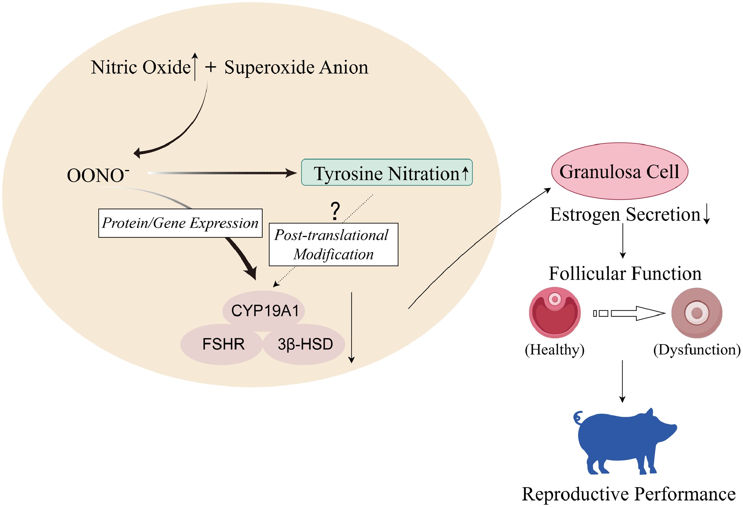 High concentrations of nitric oxide in organisms react with superoxide anions in reactive oxygen species (ROS) to generate peroxynitrite ions. In porcine ovarian GCs, OONO inhibits gene and protein expression of CYP19A1, FSHR, and 3β-HSD, thereby inhibiting GCs' E2 secretion, leading to ovarian dysfunction and affecting sows' reproductive performance. In addition, OONO will also increase the level of tyrosine nitration in GCs, but whether it will cause nitration of hormone synthesis-related proteins needs further experimental verification (figure created with Figdraw).