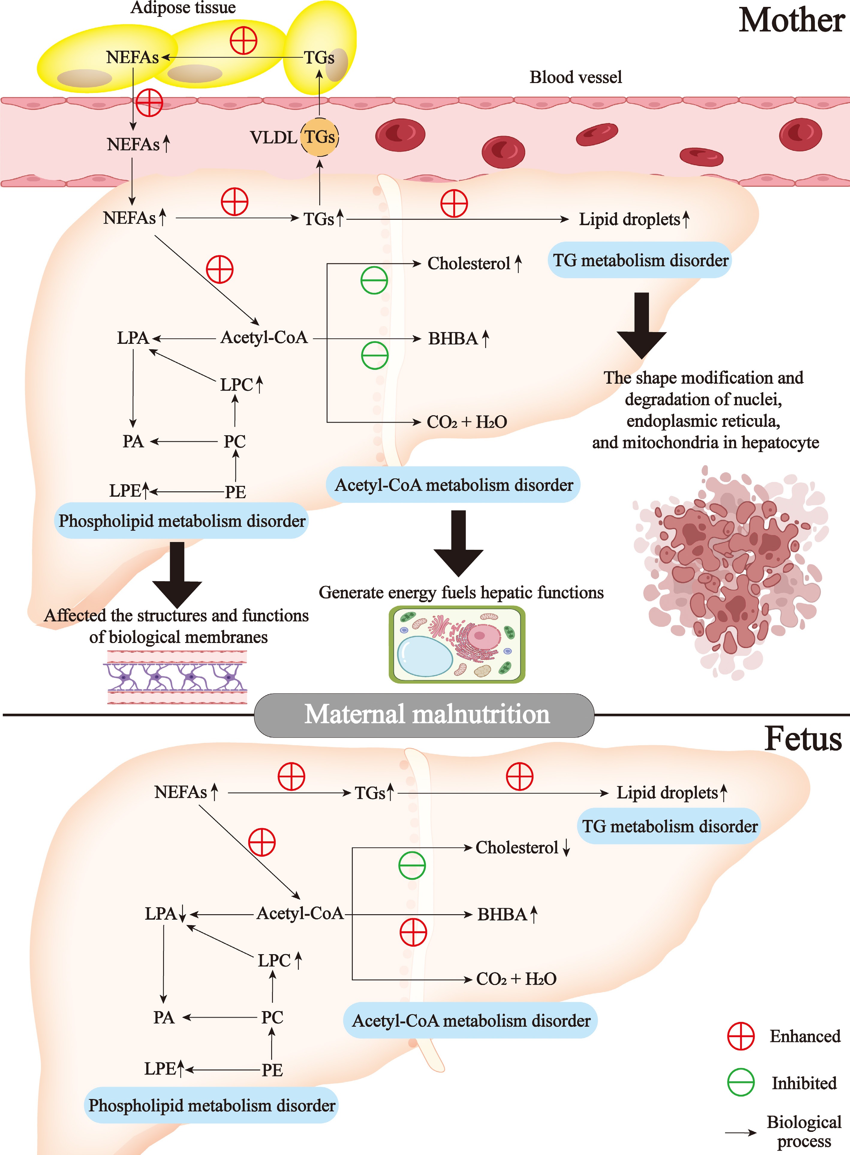 Lipid metabolism disorders in mother-child liver in response to malnutrition during late gestation. BHBA, β-hydroxybutyrate; NEFAs, non-esterified fatty acids; LPA, lysophosphatidic acid; LPC, lysophosphatidylcholine; LPE, lysophosphatidylethanolamine; TGs, triglycerides; VLDL, very low-density lipoprotein; PA, phosphatidic acid; PC, phosphatidylcholine; PE, phosphatidylethanolamine.