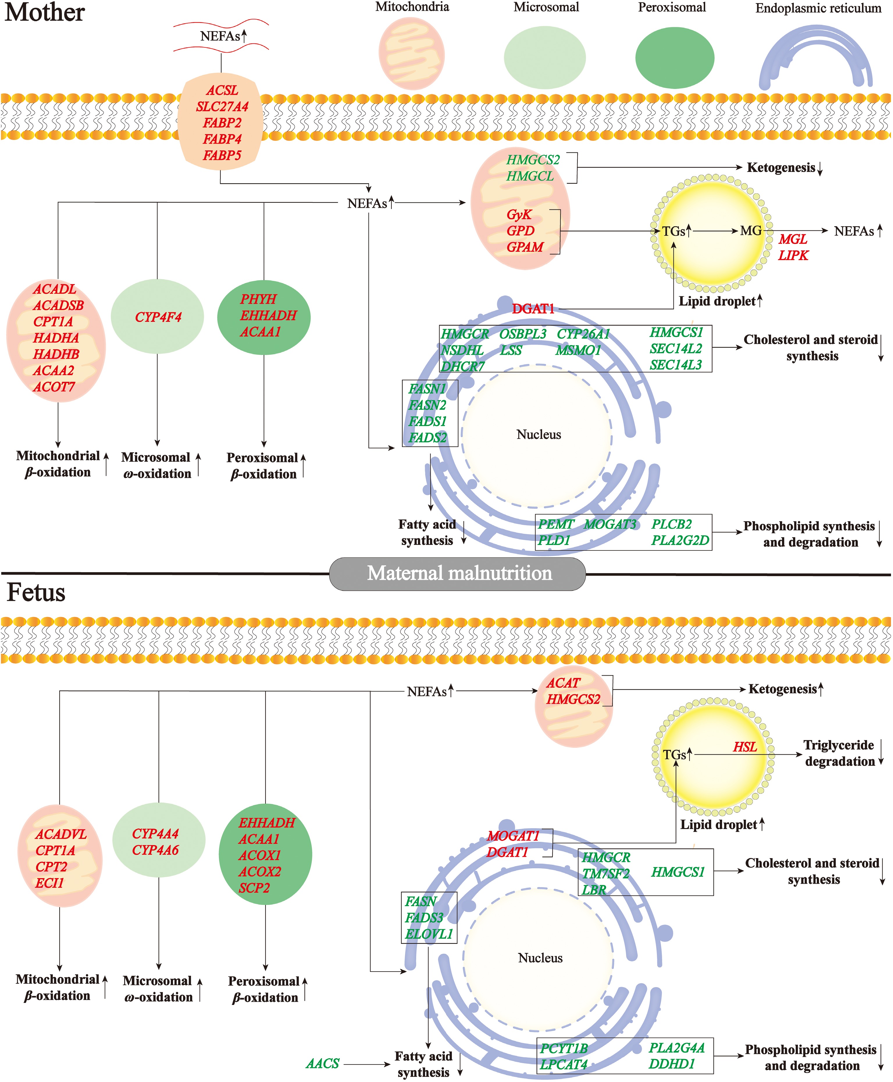 Differentially expressed genes involved in lipid metabolism in mother-child liver in response to malnutrition during late gestation. MG, monoglyceride; NEFAs, non-esterified fatty acids; TGs, triglycerides.
