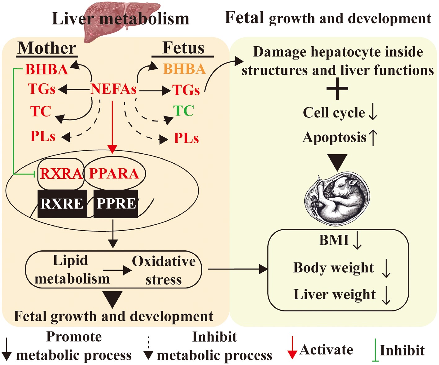 Abstract: Malnutrition is common during gestation, which threats maternal health, survival, and fetal development. The mechanisms of malnutrition-induced metabolic disorders and fetal maldevelopment are however poorly understood. In recent years, numerous studies in human and animal models have filled the gaps in the field of mother-child metabolism regarding malnutrition during gestation. This review summarizes and analyzes the lipid metabolic disorders in maternal and fetal livers, as well as fetal maldevelopment in response to malnutrition during gestation, and the regulatory mechanisms involved. Malnutrition elevates fatty acid oxidation, esterification, and lipolysis while suppressing fatty acid, cholesterol, steroid synthesis, and phospholipid metabolism both in maternal and fetal livers. Intriguingly, ketogenesis is inhibited in maternal liver but enhanced in fetal liver. Maternal malnutrition induces fetal hepatic lipid metabolic dysregulation, which suppresses DNA replication machinery and disrupts cell cycle progression, thereby creating an imbalance between cellular proliferation and apoptosis, ultimately culminating in fetal maldevelopment. Under conditions of malnutrition, non-esterified fatty acids stimulate peroxisome proliferator-activated receptor alpha (PPARA) signaling to upregulate fatty acid β-oxidation and ketogenesis, whereas β-hydroxybutyrate inhibits these metabolic processes through suppression of retinoid X receptor alpha (RXRA) signaling. Activation of PPARA/RXRA signaling pathway improves liver lipid metabolic homeostasis and alleviates oxidative stress. This review contributes to the research on mother-child nutritional metabolism and the development of novel strategies during gestation to advance the health of mother and offspring.
