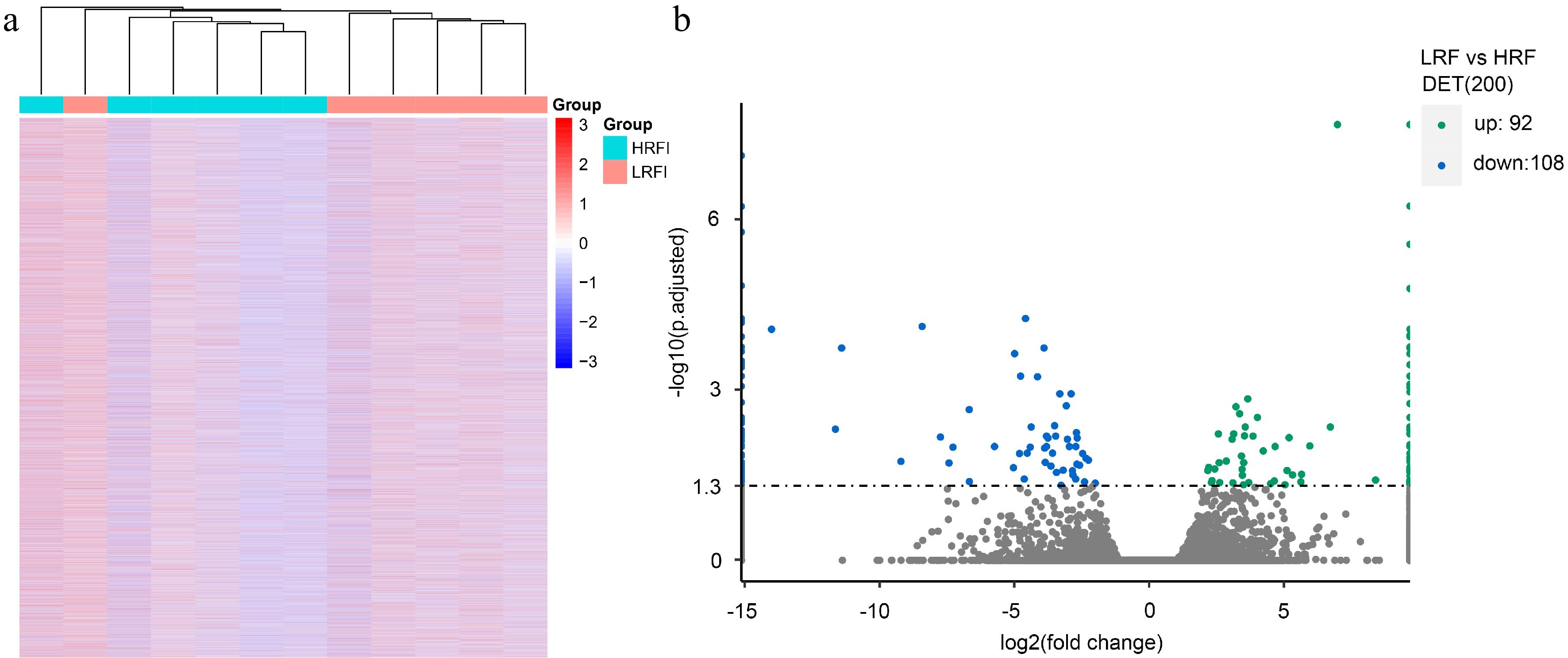 • The expression abundance of all transcripts in the liver samples from 12 carp in total from the LRFI and HRFI groups was calculated, resulting in the identification of 70,422 transcripts with detectable expression abundance. Cluster analysis based on the expression abundance of all transcripts across the 12 carp revealed that, except for one individual from the LRFI group, the remaining 11 individuals tended to cluster with their corresponding group members (Fig. 1a), indicating significant differences in the overall transcript expression patterns between individuals of the LRFI and HRFI groups. In total, 200 differentially expressed transcripts (DETs) were identified with Cuffdiff software, with 92 DETs showing increased expression and 108 DETs showing decreased expression in the LRFI group relative to the HRFI group (Fig. 1b).