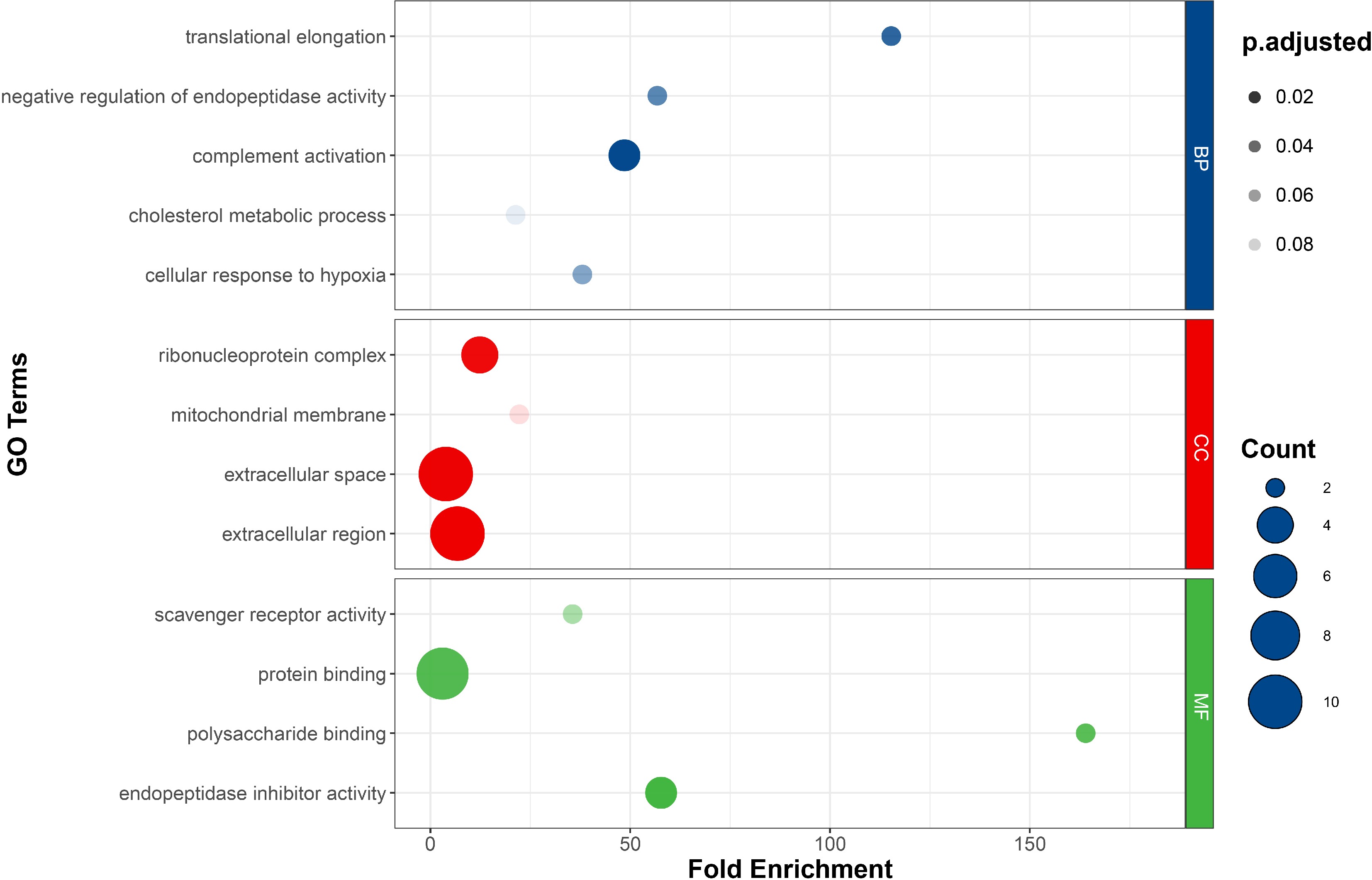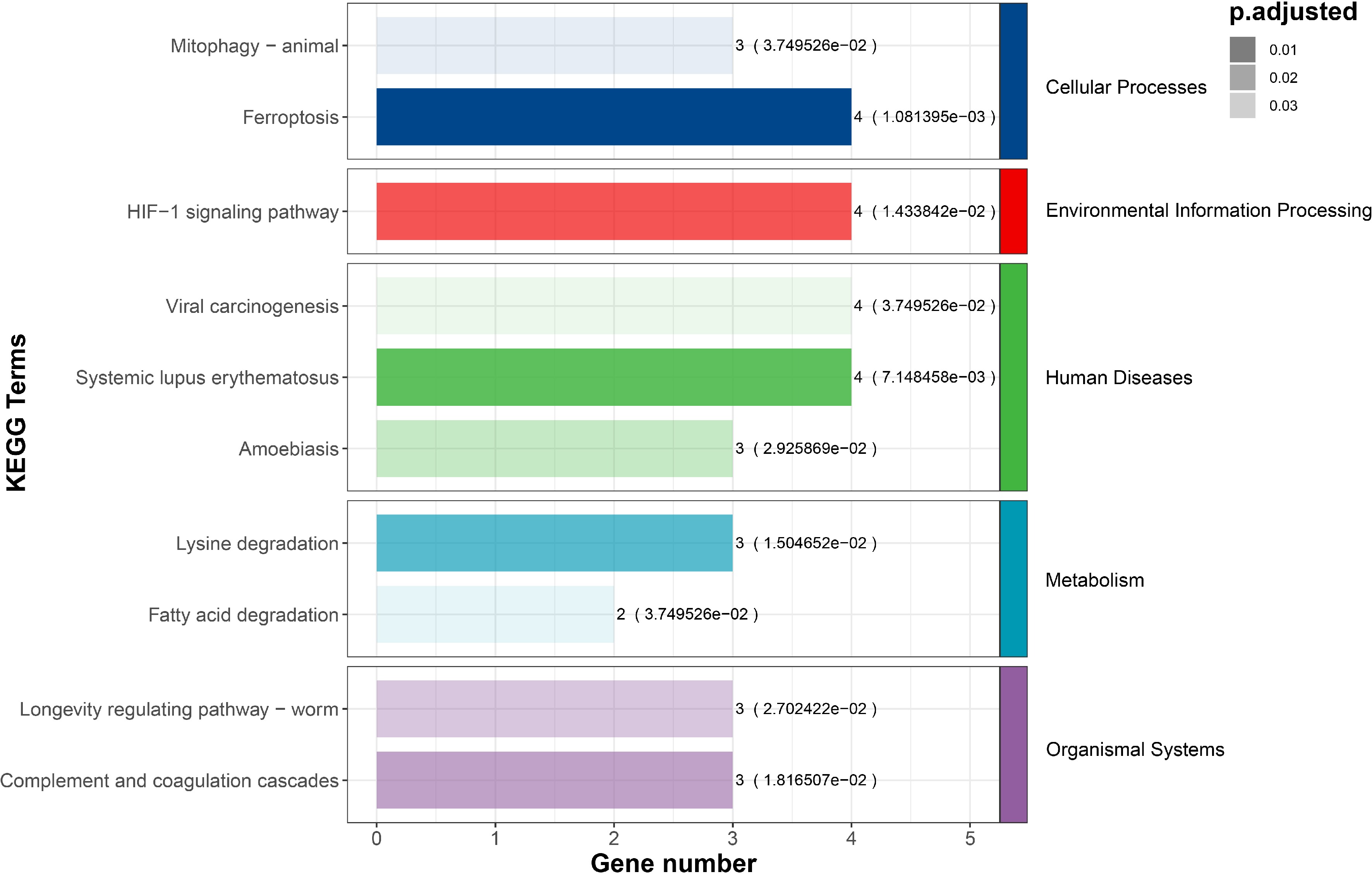 • Among the 200 DETs, 71 transcripts were considered to be AS transcripts, originating from 64 genes. These genes, referred to as differential alternative splicing genes (DASGs), were subjected to GO and KEGG enrichment analysis. In the GO enrichment analysis, DASGs were primarily involved in processes such as polysaccharide binding, translational elongation, negative regulation of endopeptidase activity, and endopeptidase inhibitor activity. Additionally, a considerable number of genes were enriched in terms such as the extracellular region (10), extracellular space (10), and protein binding (9), although the scores of fold enrichment for these terms were relatively low (Fig. 2). In the KEGG enrichment analysis, DASGs were enriched in pathways such as ferroptosis, the HIF-1 signaling pathway, and systemic lupus erythematosus with a lower adjusted p-value (Fig. 3). Metabolic pathways closely related to feed efficiency, such as lysine degradation and fatty acid degradation, were also enriched, suggesting a potential association between these pathways and the differences in feed efficiency among individuals of Jian carp.