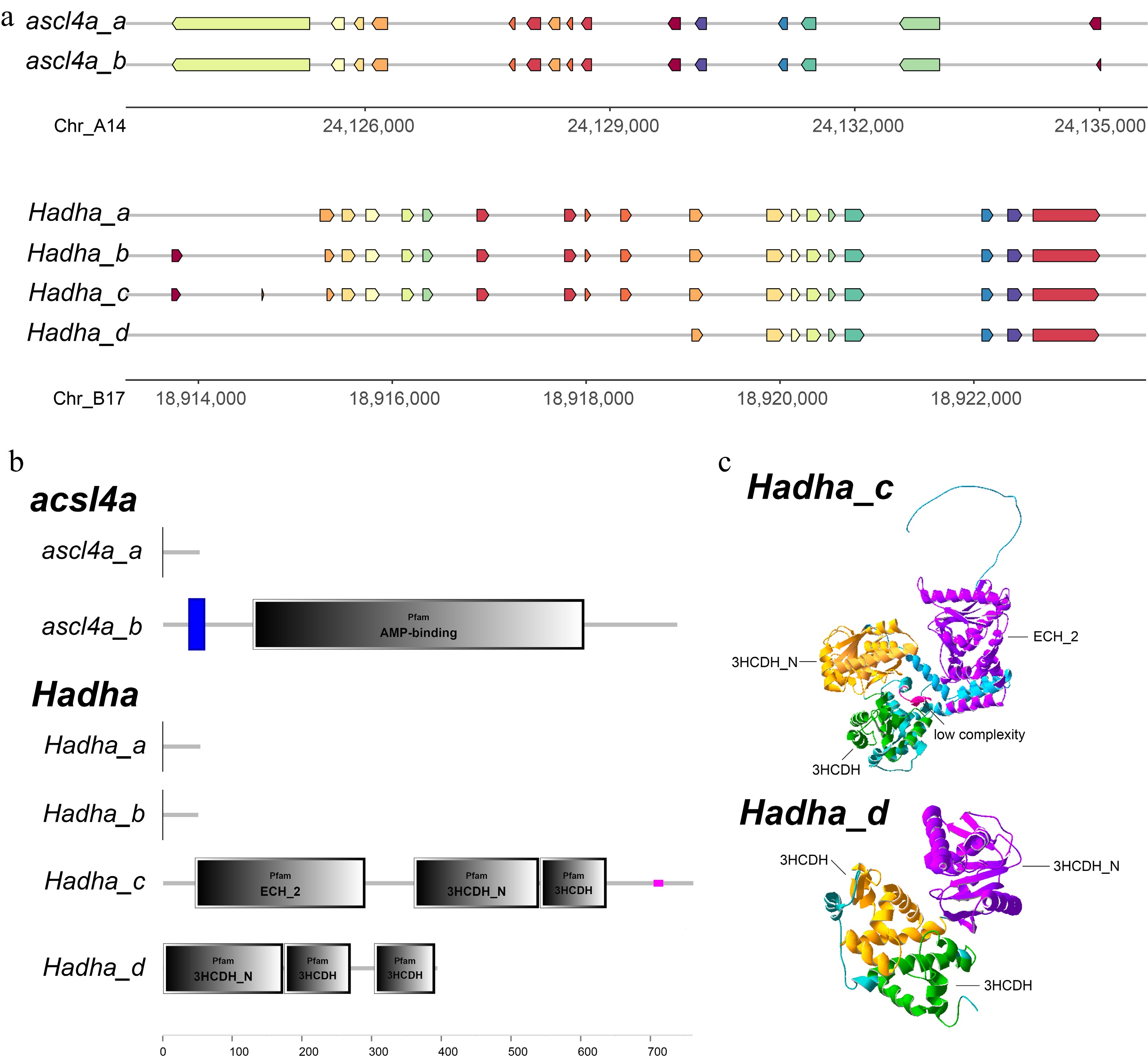 The characteristics of the acsl4a and Hadha genes. (a) The exonic disparity of transcripts derived from acsl4a and Hadha. (b) The protein structural domains of different splice variants of acsl4a and Hadha. (c) The three-dimensional structure of Hadha_c and Hadha_d proteins.