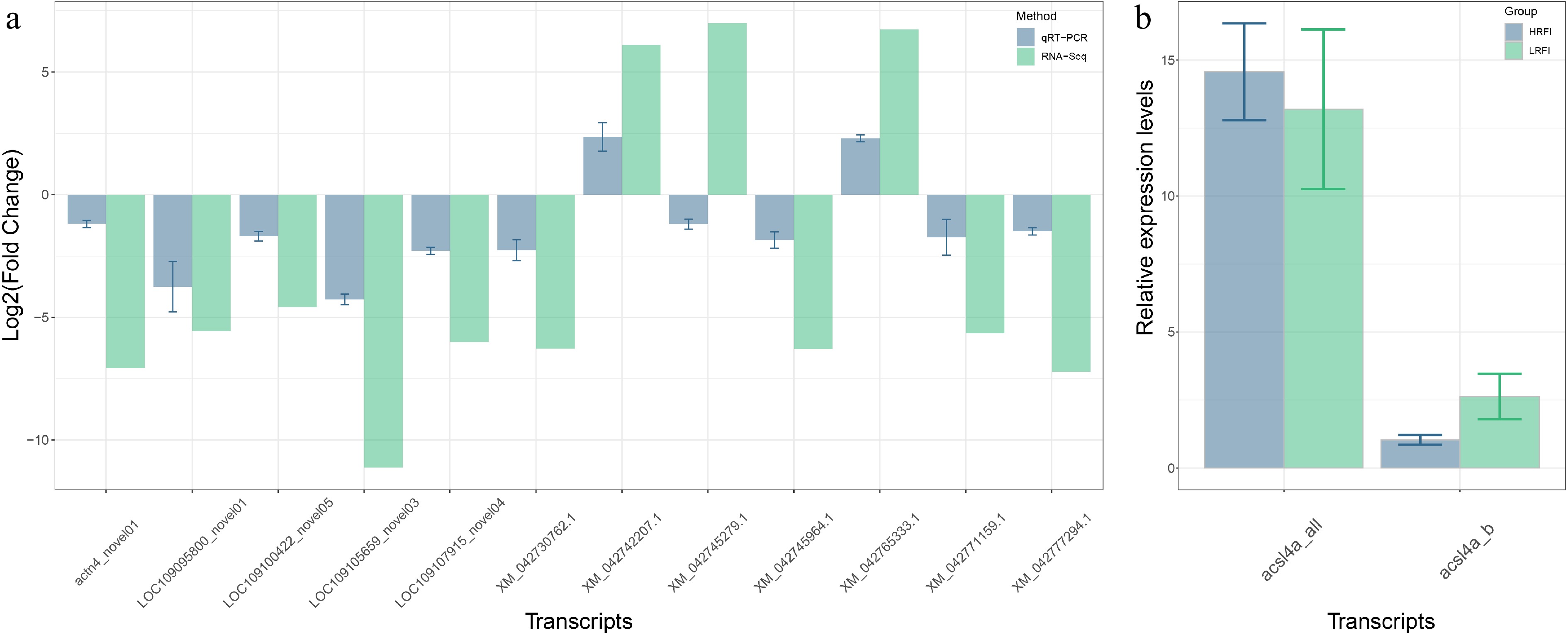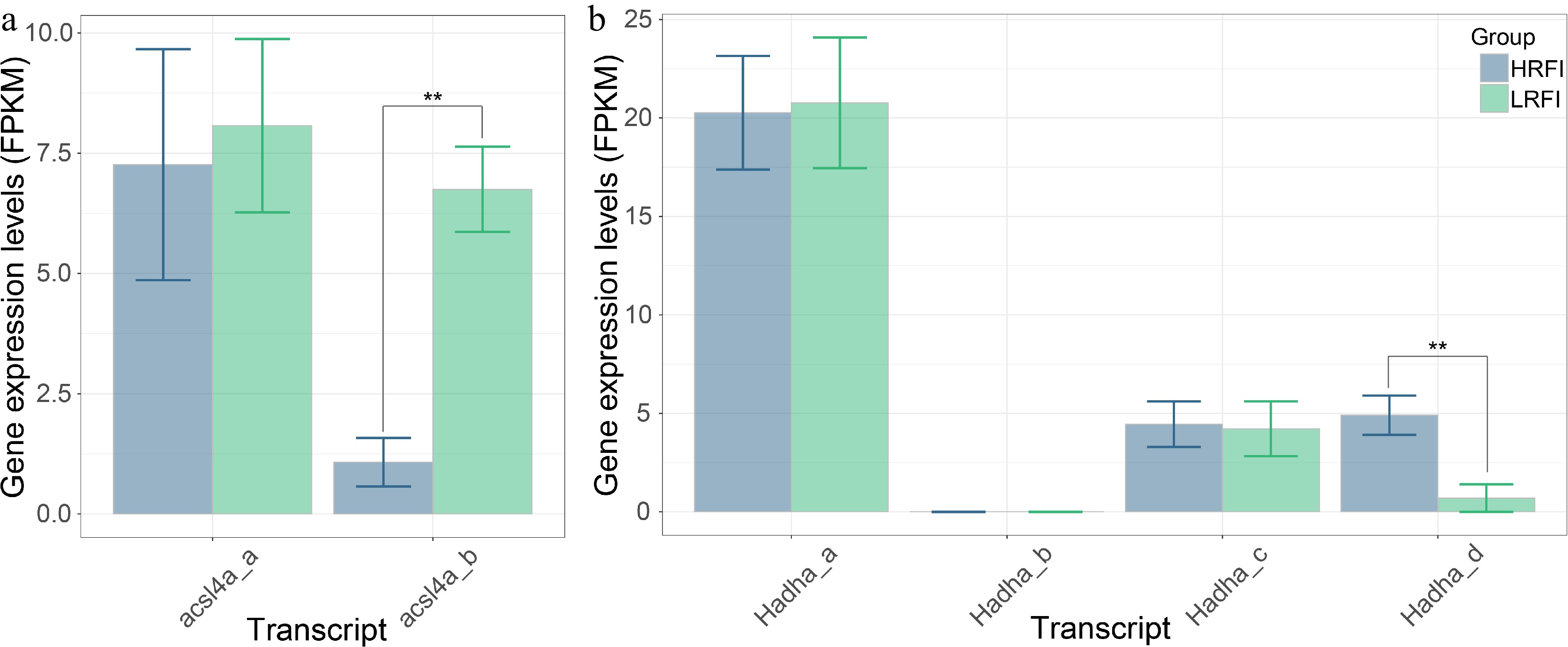 The expression profiles of transcripts derived from acsl4a (a) and Hadha (b) in the LRFI and HRFI groups.