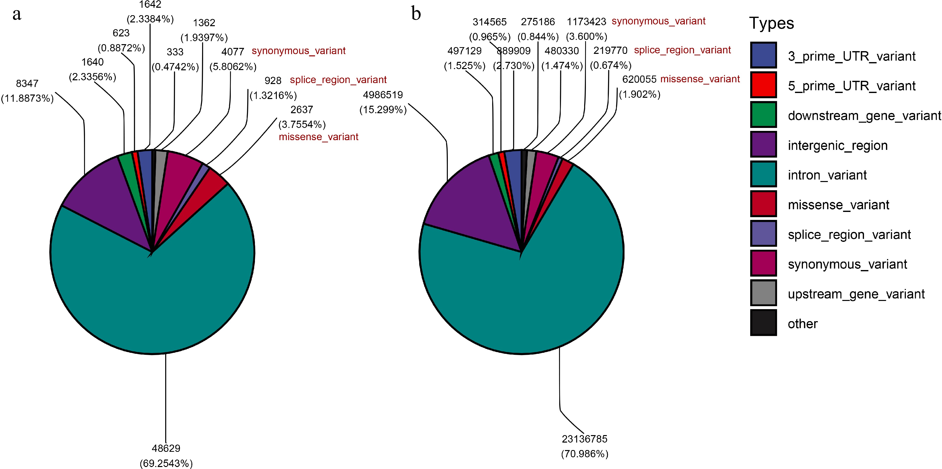 Classification of SNP types. (a) The proportion of various SNP types among SNPs associated with DASGs. (b) The proportion of various SNP types among all SNPs.