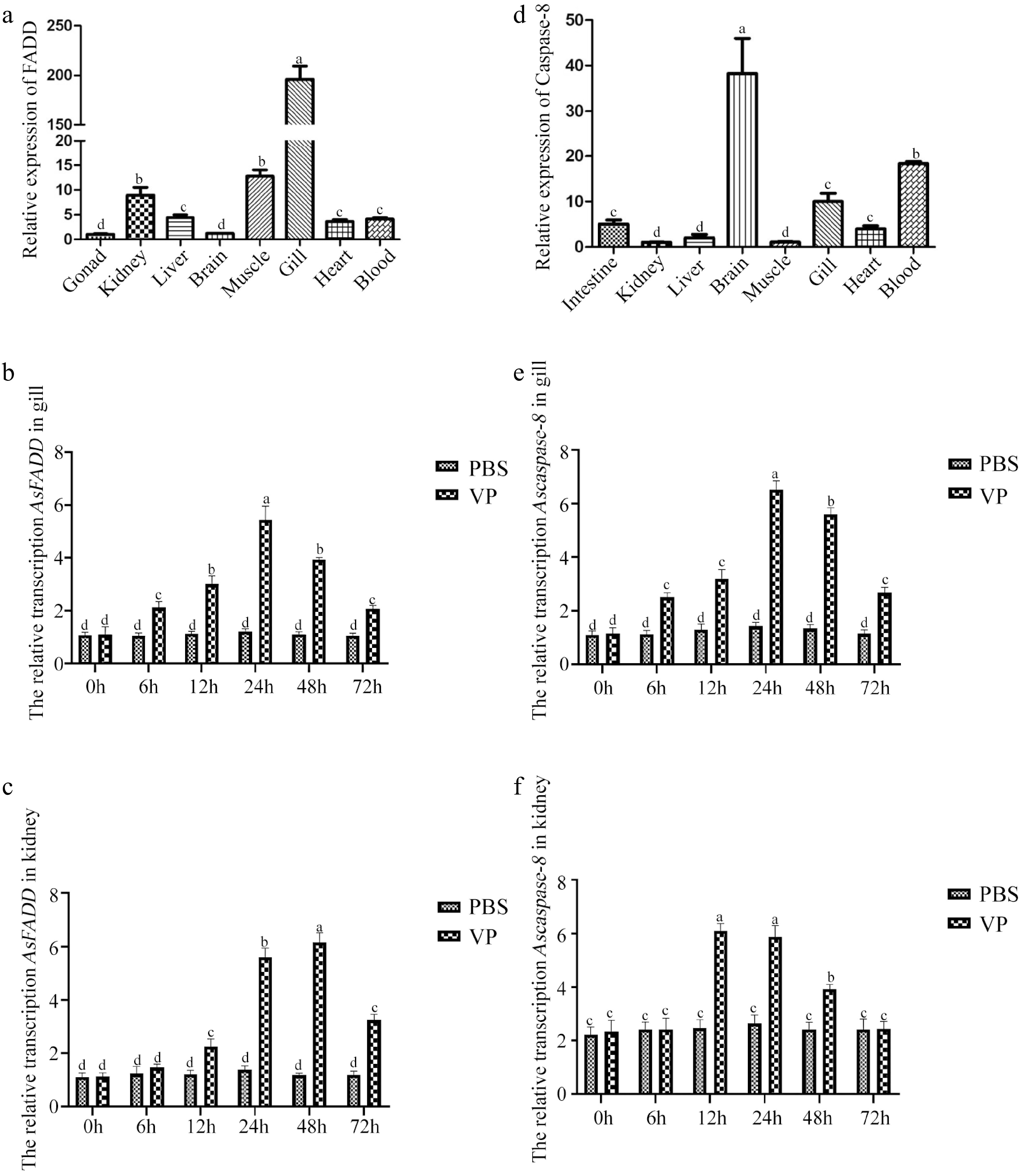 Distribution of genes in various tissues of A schlegelii and the transcription characteristics of genes in the gills and kidneys of A. schlegelii after V. parahaemolyticus infection. (a) Distribution of AsFADD in various tissues. The transcription characteristics of AsFADD in the gills (b) and kidneys (c) after V. parahaemolyticus infection. (d) Distribution of Ascaspase-8 in various tissues. The transcription characteristics of Ascaspase-8 in the gills (e) and kidneys (f) after V. parahaemolyticus infection. Error bars represent standard deviations (SD). Different letters on the bars represent statistically significant differences at p < 0.05.