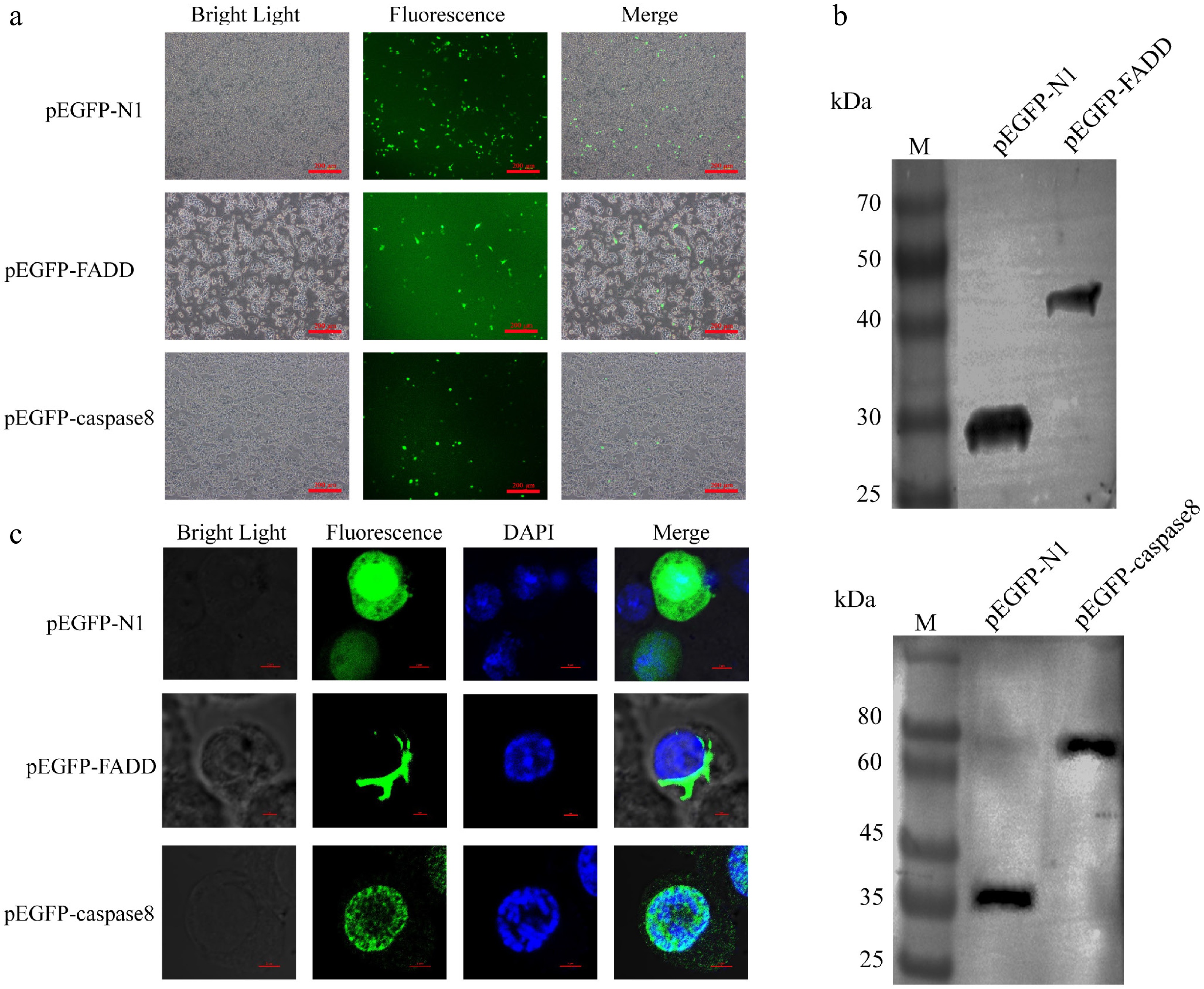 • The pEGFP–FADD and pEGFP–caspase-8 constructs were generated and introduced into RAW264.7 cells, the transfected cells showed significant green fluorescence under an inverted fluorescence microscope (Fig. 2a). As verified by Western blot analysis, the recombinant protein molecular weight of pEGFP–FADD and pEGFP–caspase-8 were about 50 kDa and 80 kDa, respectively (Fig. 2b). The results demonstrate that the pEGFP–FADD and pEGFP–caspase-8 recombinant plasmids were successfully expressed in RAW264.7 cells. Then the cellular locations of pEGFP–FADD and pEGFP–caspase-8 were investigated. Confocal microscopy revealed AsFADD predominantly in the cytoplasm and Ascaspase-8 primarily in the nucleus (Fig. 2c).