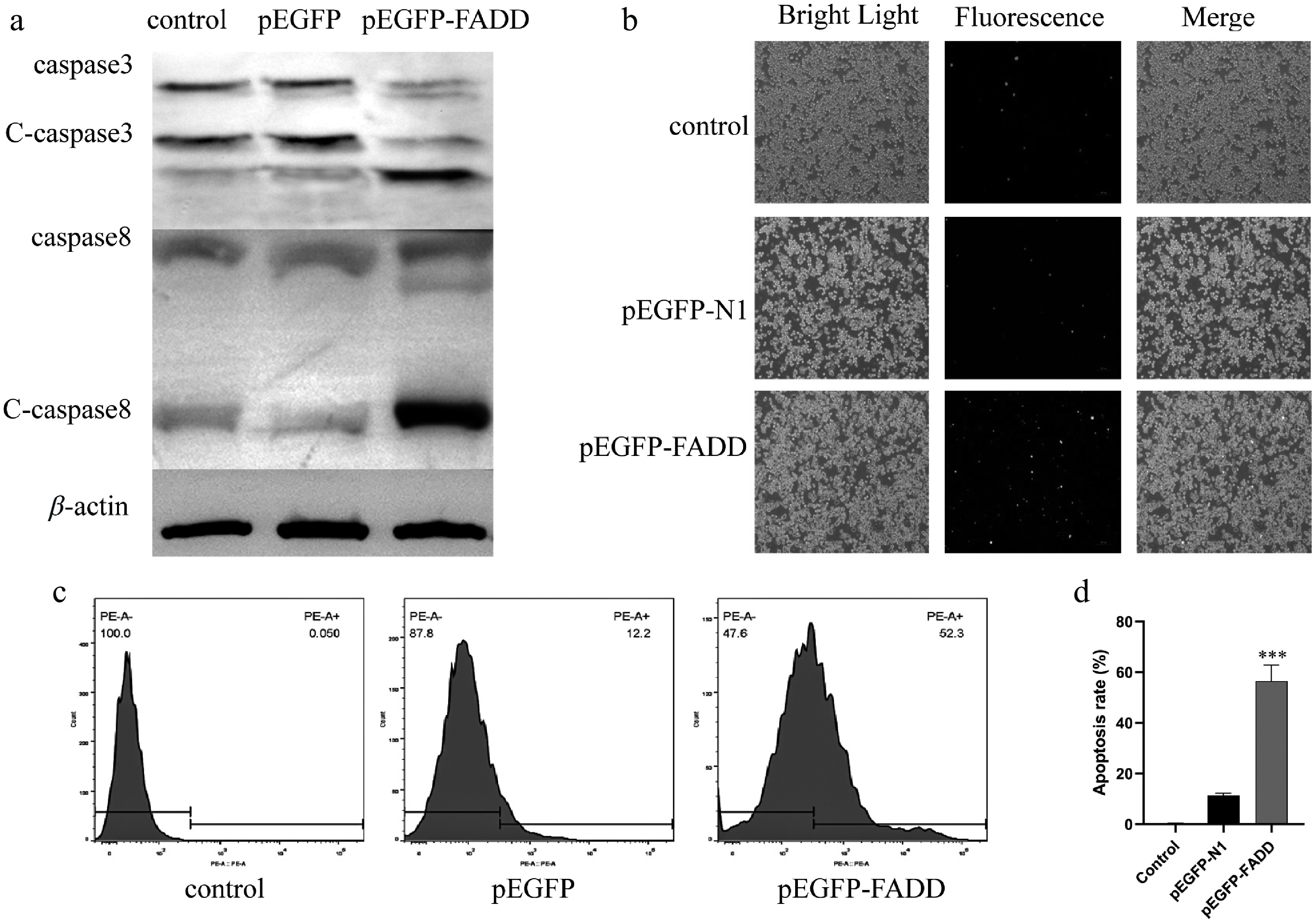 Effect of overexpression of pEGFP–FADD on apoptosis in RAW264.7 cells. (a) The protein expression levels of c-caspase-3 and c-caspase-8 were detected by Western blot analysis. (b) Apoptosis fluorescence was detected by an inverted fluorescence microscope. Scale bar, 4 μm. (c, d) The percentage of PE-positive cells after pEGFP–FADD overexpression was analyzed by flow cytometry.