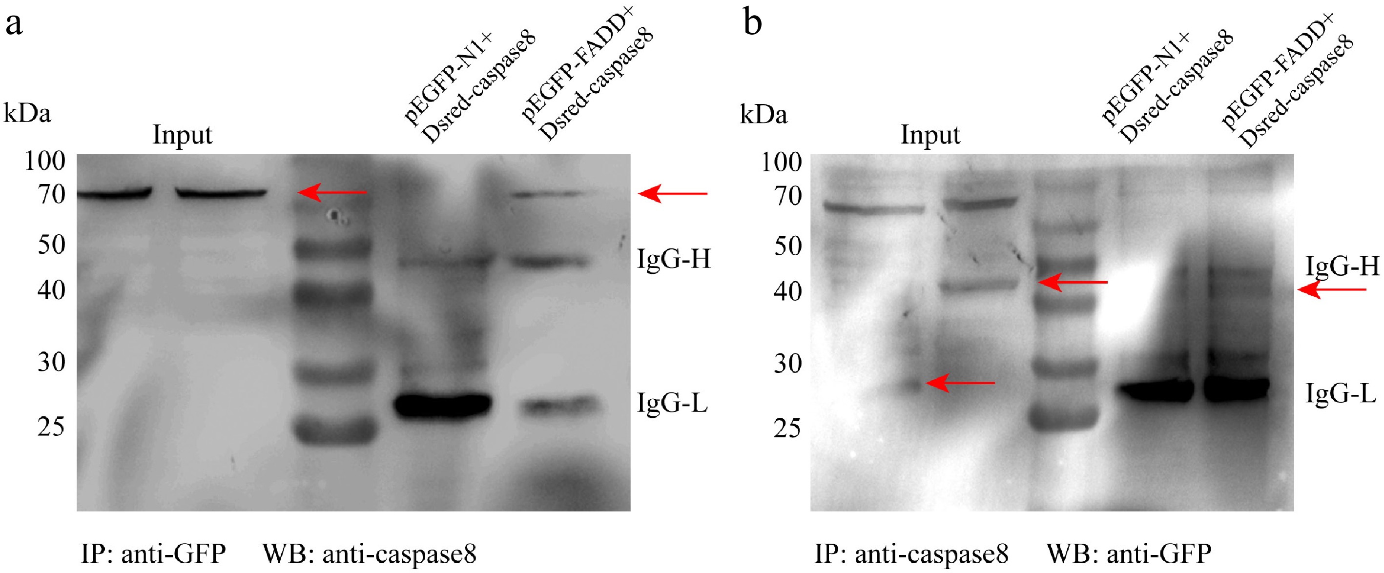 • Co-IP assays were performed to confirm the interaction between FADD and caspase-8 in RAW264.7 cells. The plasmid pEGFP–FADD and pDsRED–caspase-8 were co-transfected into RAW264.7 cells. After 12 h, 400 µL of NP-40 lysate (Boster, China) and 5 µL of PMSF (Transgen, China) were included and lysed for 30 min on ice. The cell lysates were collected by vortexing them for 10 min (1,400 × g) at 4 °C. They were then left to incubate overnight at the same temperature with two specific antibodies: an anti-GFP mouse monoclonal antibody from Transgen in China and a caspase-8 antibody from Abmart, China. Following this, Protein A/G Resin (Transgen, China) was introduced and allowed to incubate at 4 °C for 4 h. After another round of centrifugation at 1,000 ×g for 5 min and a thorough rinse with ice-cold PBS three times, the resulting precipitate was analyzed using Western blot techniques.