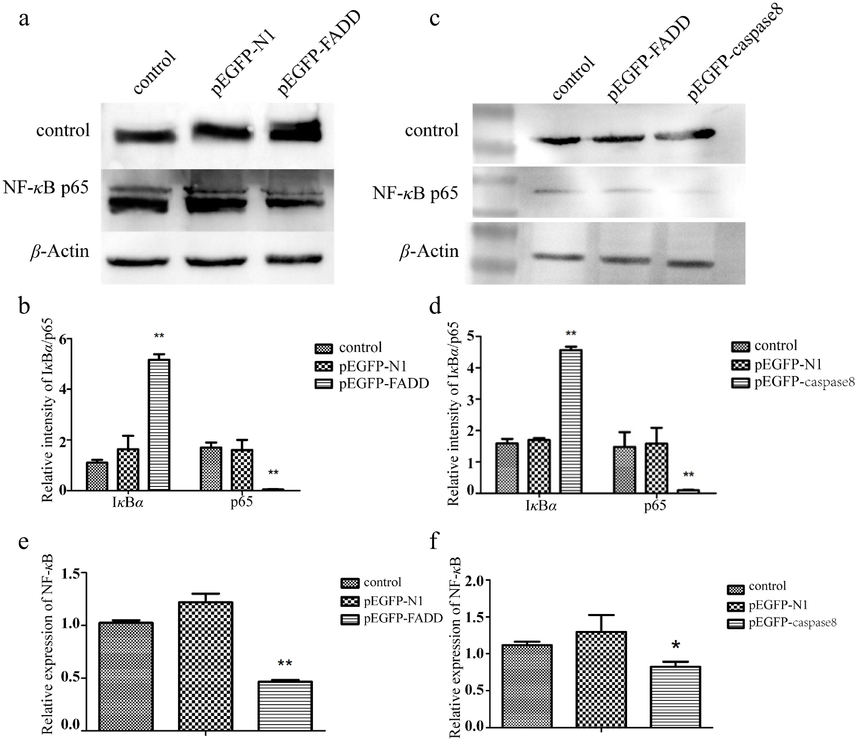 • To investigate the relationship between apoptosis and the inflammatory response, the NF-κB signaling pathway was detected by Western blotting and qRT-PCR after overexpression of AsFADD and Ascaspase-8 in RAW264.7 cells. The Western blot analysis results showed that the expression of IκBα after transfection with pEGFP–FADD (Fig. 5a, c) or pEGFP–caspase-8 (Fig. 5b, d) were significantly increased, while the expression of p65 protein in the experimental group was significantly decreased. The qRT-PCR analysis further confirmed suppression of the NF-κB pathway in RAW264.7 cells transfected with pEGFP–FADD or pEGFP–caspase-8, characterized by upregulated IκBα transcription and downregulated p65 expression (Fig. 5e, f).