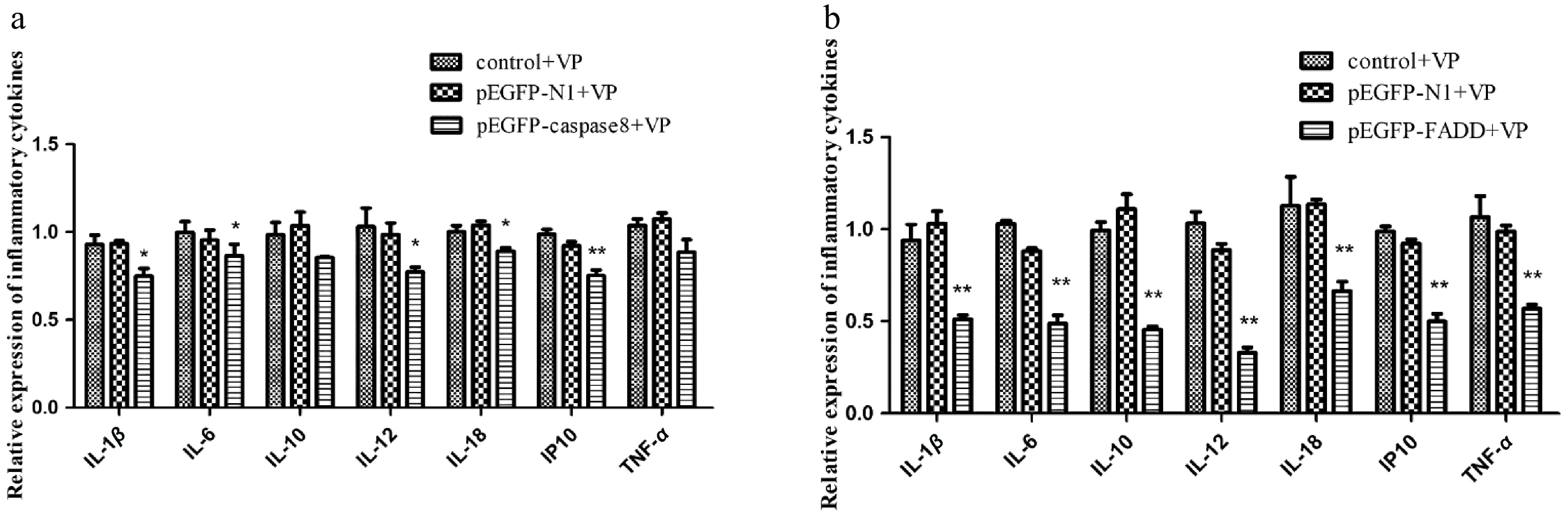 The effect of the overexpression of pEGFP–caspase-8 on downstream inflammatory factors when infected with V. parahaemolyticus. The expression levels of IL-1β, IL-6, IL-10, IL-12, IL-18, IP10, and TNF-α were detected by qRT-PCR, and GAPDH was used as internal reference. (a) pEGFP–FADD. (b) pEGFP–caspase-8. Vertical bars represent the mean ± SE (n = 3), and significant differences are marked with asterisks (* p < 0.05, ** p < 0.01).