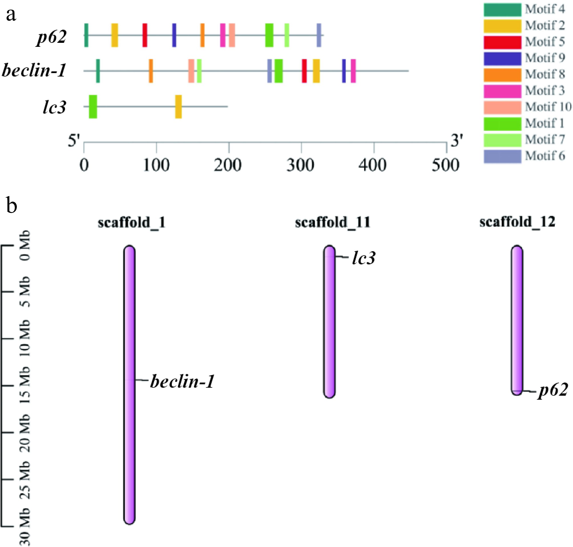 • The relative molecular weights of lc3, beclin-1, and p62 were 14.72, 51.23 and 45.49 kDa, respectively. Their sizes ranged from 125 to 447 amino acids (aa), and PI ranged from pH 4.57 to 8.96. The subcellular localization prediction of the three autophagy factors indicated that they are localized in the cytoplasm. Figure 1a illustrates the 10 conserved motifs that are common across autophagy proteins. Among these, lc3 contains Motifs 1 and 2, whereas beclin-1 and p62 contain the most motifs. As shown in Fig. 1b, beclin-1 exists on chromosome 1, lc3 is on chromosome 11 and p62 is on chromosome 12. Their irregular distribution indicates that they play a role in the genome. The positions of three autophagy genes on T. fasciatus were estimated, and the three genes were located at different positions on different chromosomes.