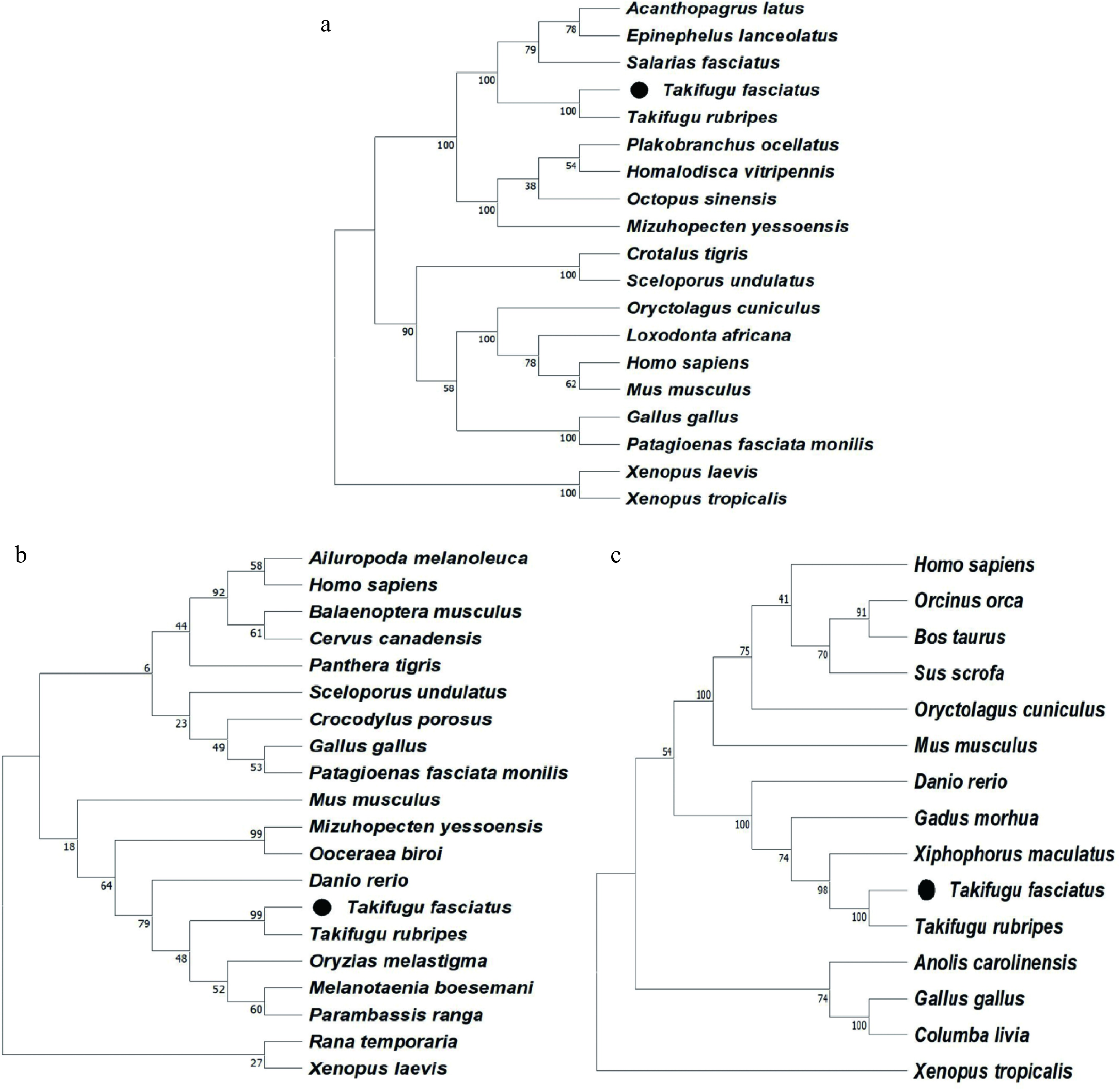 In this study, a phylogenetic analysis was conducted using MEGAX software and the neighbor-joining method. The analysis revealed that the lc3 (Fig. 2a), beclin-1 (Fig. 2b), and p62 (Fig. 2c) genes of T. fasciatus are highly conserved throughout teleosts' evolution.