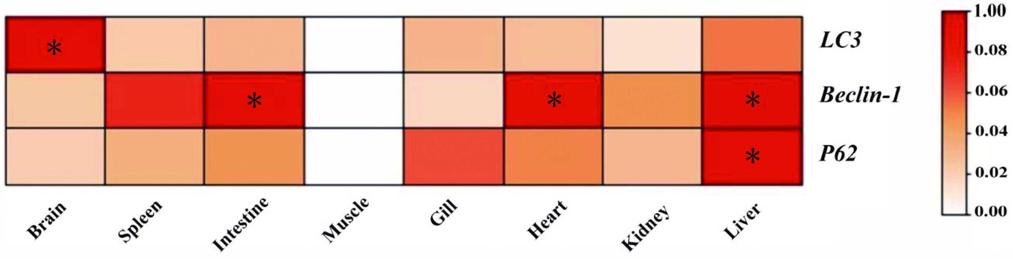 • This study investigated the relative expression of autophagy genes in various tissues, including the brain, spleen, intestine, gill, muscle, heart, kidney and liver, with the tissue distribution of lc3, beclin-1, and p62 being as shown in Fig. 3. Patterns of autophagy gene expression were seen in every tissue that was examined. The brain and liver showed the highest levels of lc3 mRNA expression. The liver, heart and gut all had similar levels of beclin-1 expression, which was significantly greater than in other organs. The liver showed the highest expression of p62.