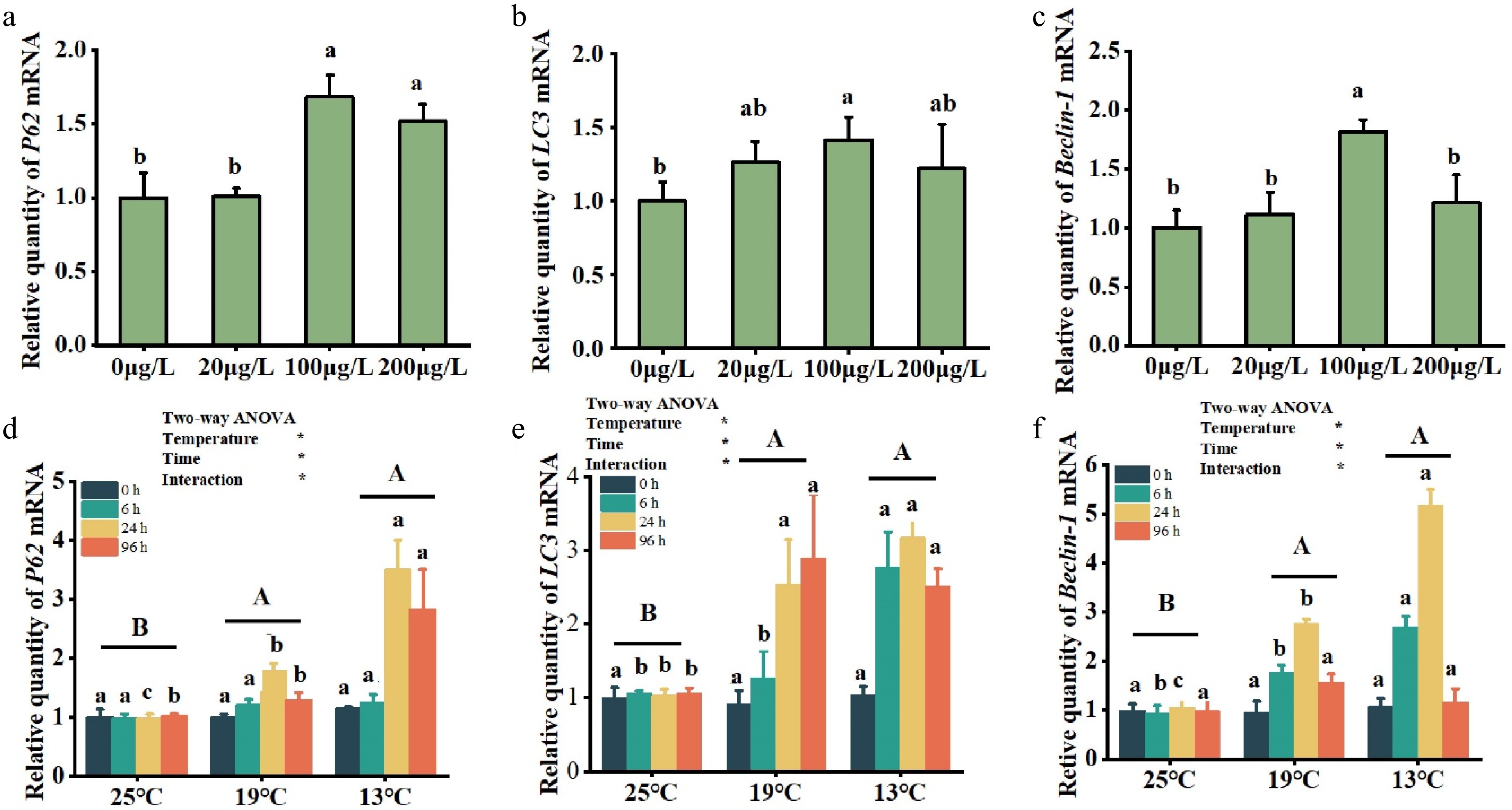 • qRT-PCR was used to analyze the expression levels of lc3, beclin-1 and p62 in the liver of T. fasciatus under Cu2+ and low-temperature stress.