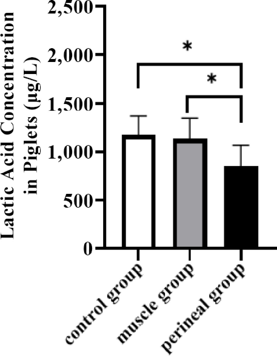 To further evaluate the effects of carazolol injection sites on piglet asphyxia, the lactic acid concentration in piglets from primiparous sows was measured. No significant differences in the lactic acid concentrations of piglets were found between the intramuscular and vulvar injection groups (p \gt 0.05). However, a downward trend in lactic acid concentrations were found in the piglets from both the intramuscular and vulvar groups (Fig. 2).