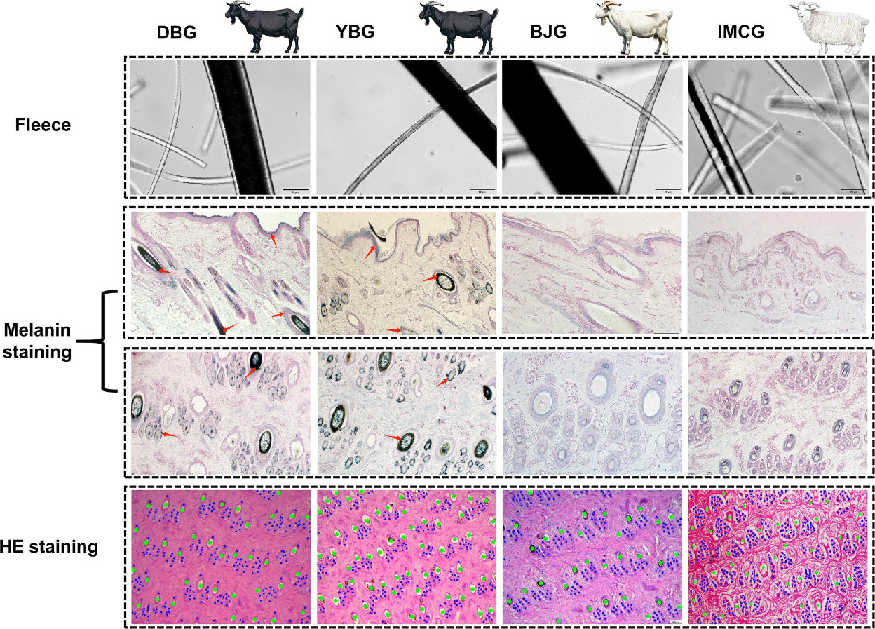 Histological analysis of four native goat breeds in China. Breeds: Representative animals of DBG, YBG, BJG, and IMCG. Fleece: coarse hair and cashmere under an inverted microscope. Melanin staining: staining results from transverse and longitudinal skin slices of four breeds of goats. The red arrows point to the sites where melanin is deposited.