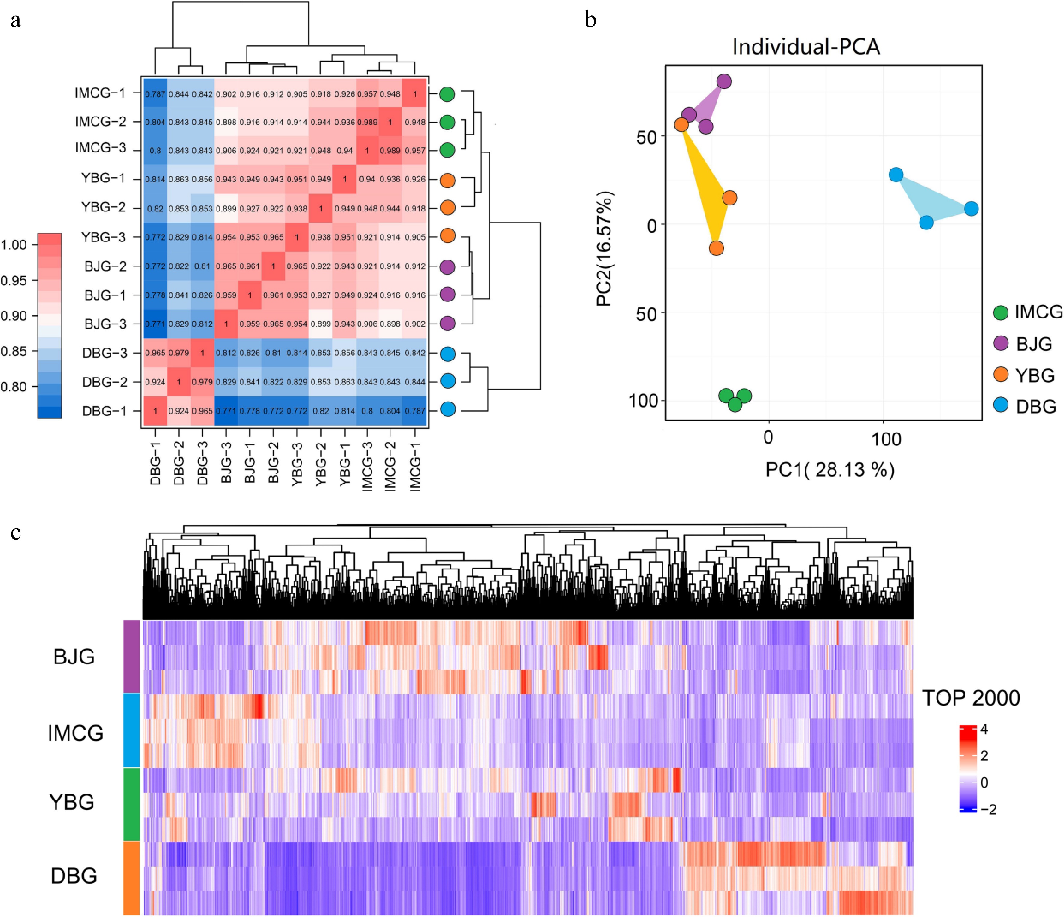• RNA-seq generated a wide range of raw reads in different samples of BJG, DBG, IMCG, and YBG, with a total of 274,187,428 clean reads acquired from 12 sequencing libraries. The alignment of these reads resulted in 96.64%–97.60% of the reads being successfully mapped to the reference genome (ARS1). In addition, all 12 sequenced samples showed a Q30 base percentage above 94.33% and a GC content of ~50%, indicating high-quality RNA-seq data suitable for further analysis. No sequencing bias was detected across the dataset. Detailed statistics for each sample group are presented in Table 3. Gene expression levels of all samples were evaluated using fragments per kilobase per million mapped reads (FPKM). Pearson's correlation coefficients among samples of the same breed were close to 1 (Fig. 2a). High intergroup reproducibility was also confirmed through principal component analysis (PCA) (Fig. 2b). Additionally, the results of the top 2,000 gene clustering results showed consistent expression patterns (Fig. 2c). These results demonstrated strong reproducibility, supporting the reliability of the data for subsequent analyses.