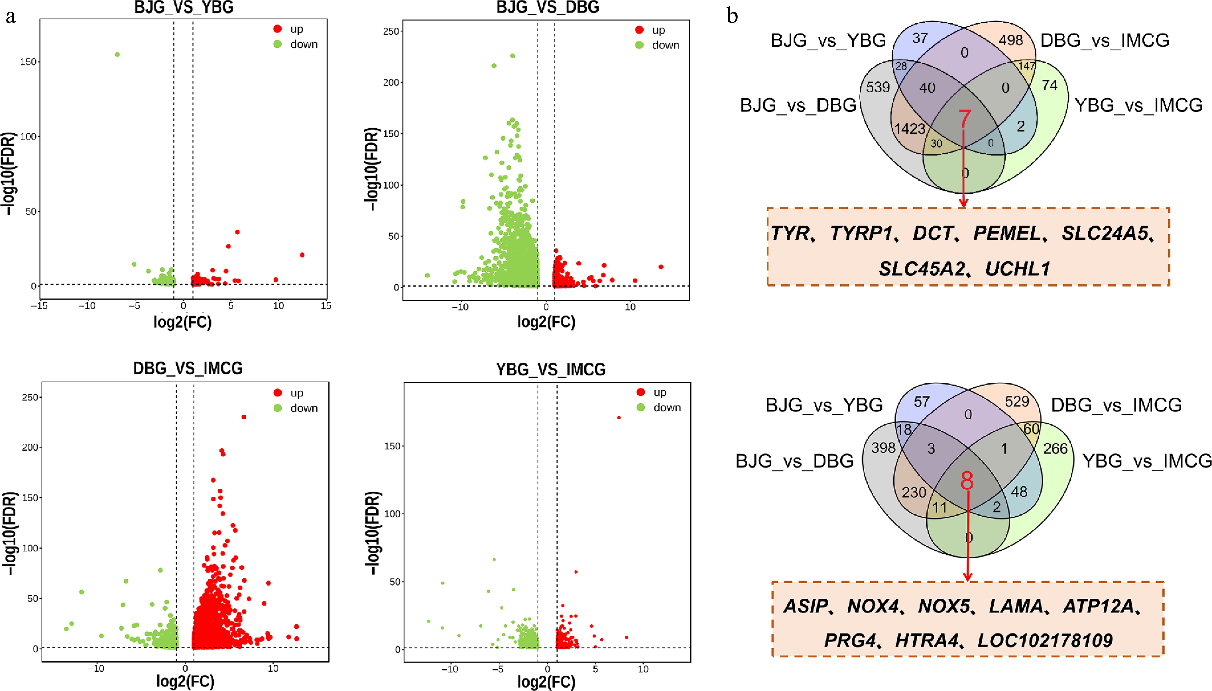 Identification of core genes related to coat color.(a) Volcano plot of genes among black and white hair goats, including BJG vs YBG, BJG vs DBG, DBG vs IMCG, YBG vs IMCG; (b) overlapping genes among four comparisons.