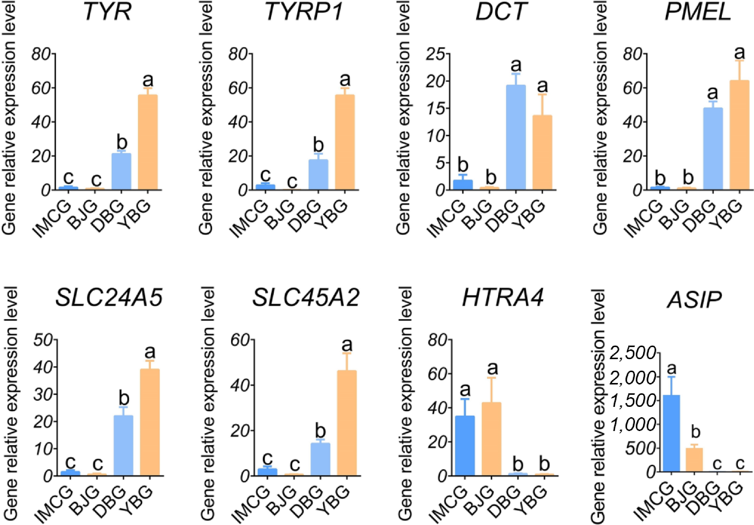 • The phenotyping outcomes classified the four breeds in this study into the black goat group (DBG, YBG) and the white goat group (BJG, IMCG). Further statistical analysis of the genes that were differentially expressed by different color groupings was performed to screen candidate key genes for pigmentation of the goat coat. In four black and white goat comparisons, BJG vs. YBG, BJG vs. DBG, DBG vs. IMCG, and YBG vs. IMCG, we identified 252, 2,938, 2,988, and 657 genes, respectively (Fig. 3a). Fifteen overlapping genes were consistently differentially expressed between black- and white-coated goats. Our results showed that TYR, TYRP1, TYRP2, PMEL, SLC24A5, SLC45A2, and UCHL1 were upregulated and the genes ASIP, HTRA4, LAMA2, LOC102178109, NOX4, ATP12A, NOX5, and PRG4 were downregulated (Fig. 3b).