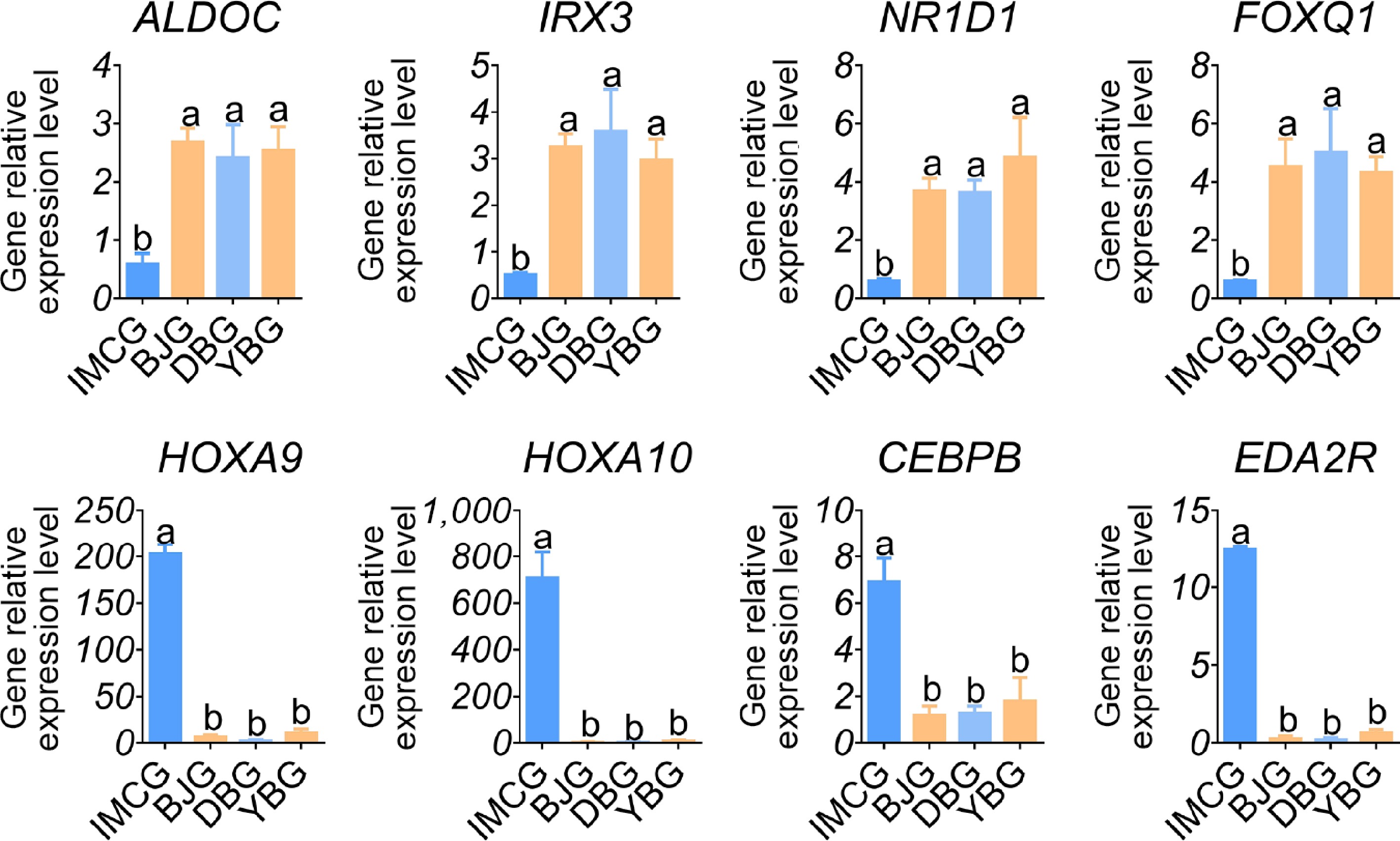 • In order to screen the relevant genes regulating fiber length in the IMCG breed, we compared the transcriptome sequencing data of each of the three non-cashmere goat breeds (BJG, DBG, and YBG) with IMCG. Between BJG and IMCG, 1,389 DEGs were identified, with 688 upregulated and 701 downregulated. In the DBG vs. YBG comparison, 2,988 DEGs were identified, including 2,146 upregulated and 842 downregulated genes. In the YBG vs. IMCG comparison, 657 DEGs were identified, including 261 upregulated and 396 downregulated genes (Fig. 4a). Venn analysis was performed to identify stable DEGs and identified 135 co-downregulated and 41 co-upregulated genes. On the basis of these overlapped genes, we performed a literature survey. Genes including FOXQ1, HOXA9, HOXA10, CEBPB, EDA2R, and SOX10 were found that related to 'skin', 'hair follicle', or 'cashmere' (Fig. 4b).