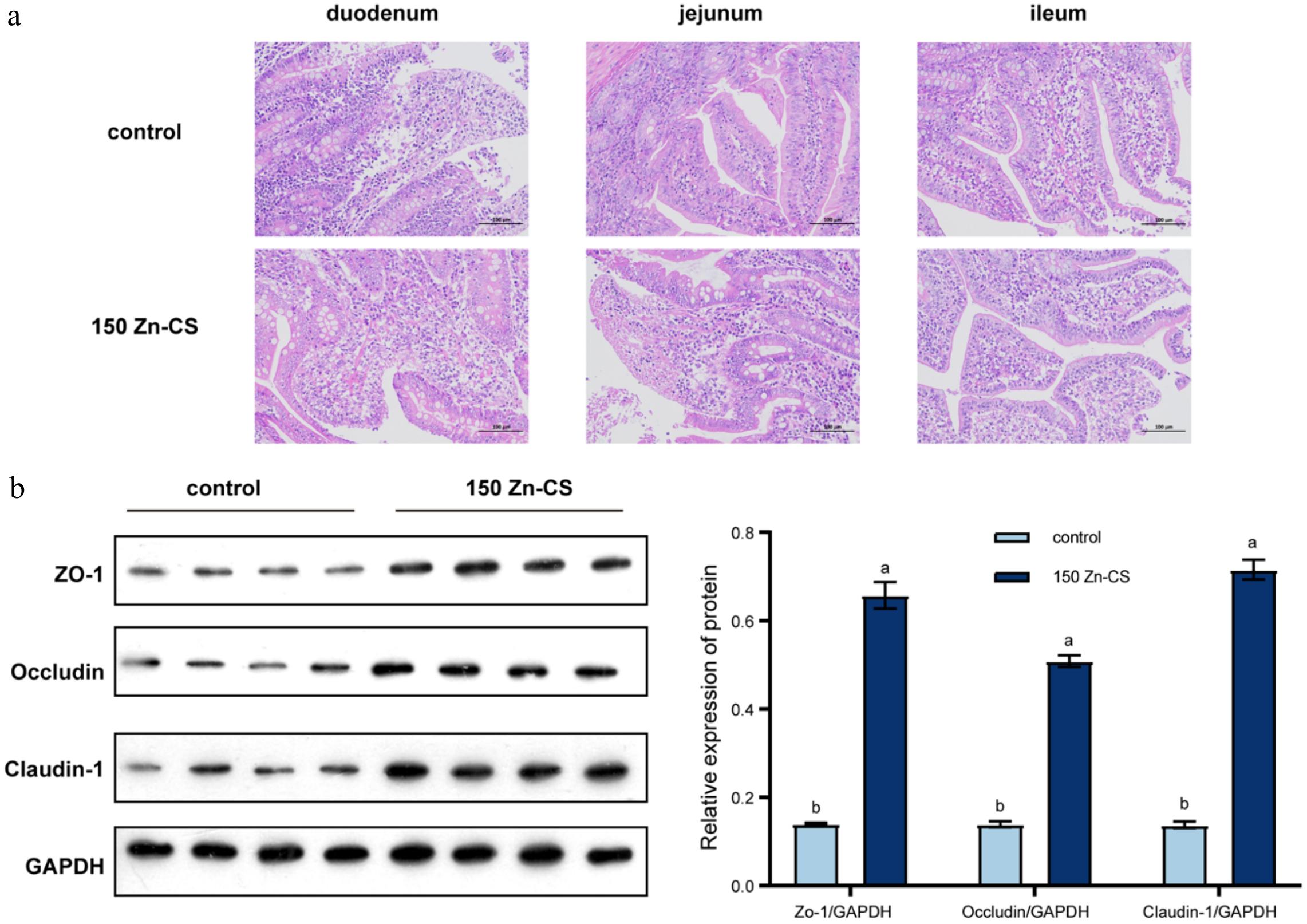Effects of Zn-CS supplementation on small intestinal morphology and the expression of jejunal tight junction proteins. (a) Representative histological images of the jejunum (H&E staining, 200× magnification). (b) The protein expression levels of ZO-1, occludin, and Claudin-1 in the jejunum were detected via Western blot analysis. Data are presented as the means ± SEM (n = 4). Different lowercase letters indicate significantly different values (p < 0.05, by analysis of variance).