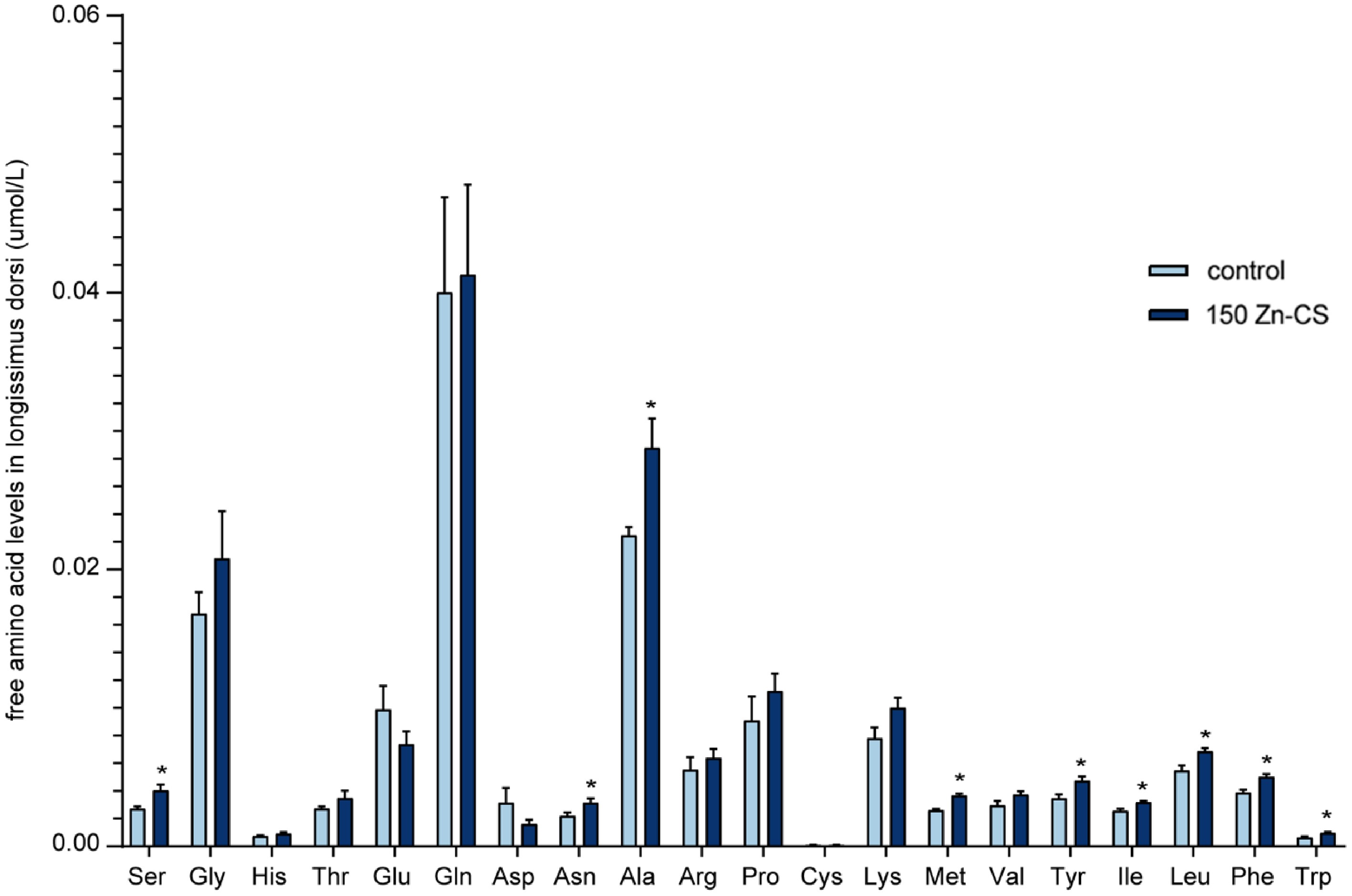 Effects of Zn-CS supplementation on free amino acid concentrations in longissimus dorsi muscles. Data are the means (n = 6; *, p < 0.05, by analysis of variance). Ser, serine; Gly, glycine; His, histidine; Thr, threonine; Glu, glutamic acid; Gln, glutamine; Asp, aspartic acid; Asn, asparagine; Ala, alanine; Arg, arginine; Pro, proline; Cys, cysteine; Lys, lysine; Met, methionine; Val, valine; Tyr, tyrosine; Ile, isoleucine; Leu, leucine; Phe, phenylalanine; Trp, tryptophan.
