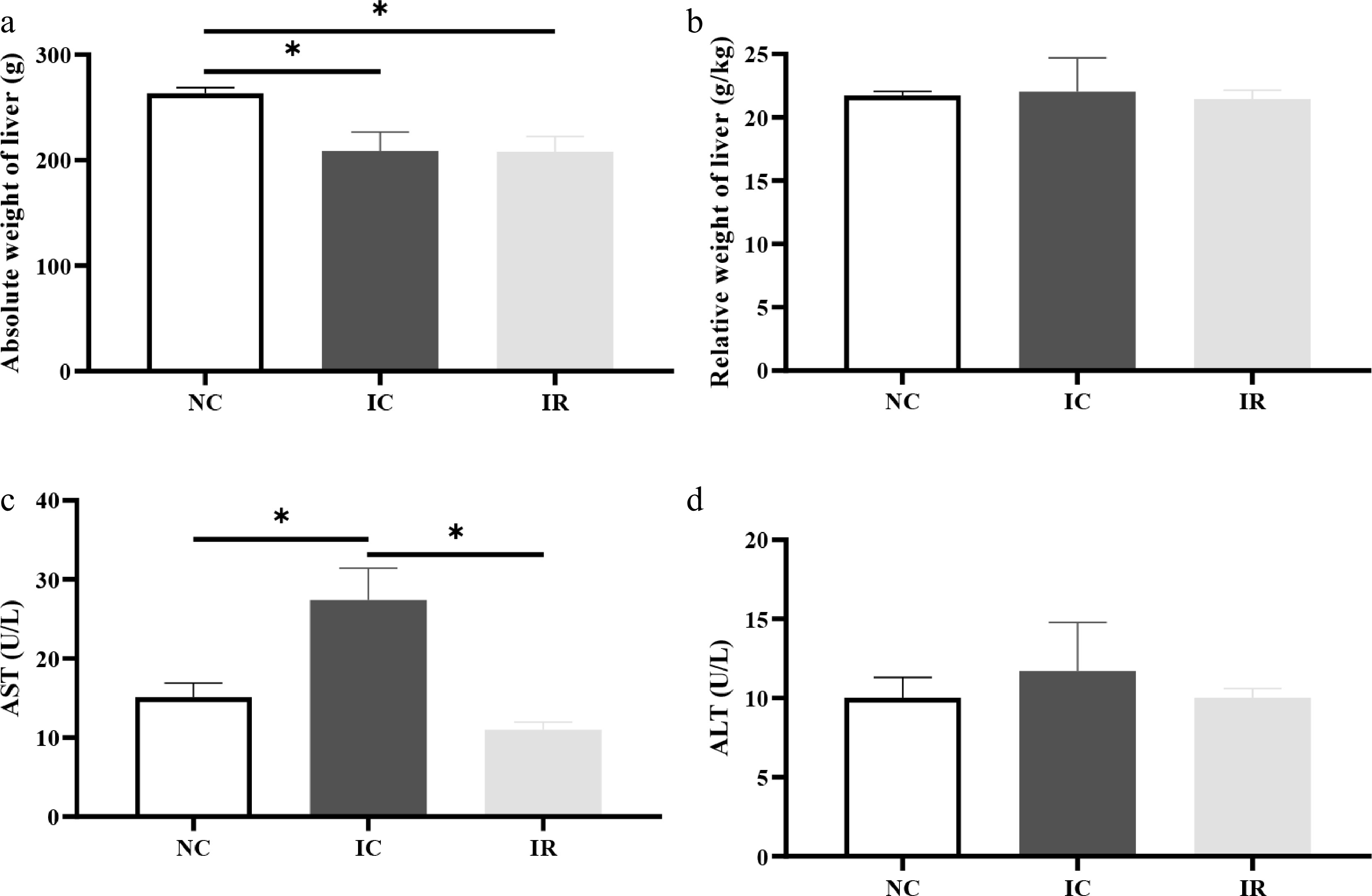 Resveratrol alleviates liver damage in weaned piglets with intrauterine growth retardation. (a) Absolute weight of liver, (b) relative weight of liver, (c) serum aspartate aminotransferase (AST) activity, (d) serum alanine aminotransferase (ALT) activity. NC, piglets with normal birth weight fed a basal diet; IC, piglets with intrauterine growth retardation fed a basal diet; IR, piglets with intrauterine growth retardation fed a basal diet supplemented with 300 mg/kg RSV. Results are presented as means and standard errors. * p < 0.05.