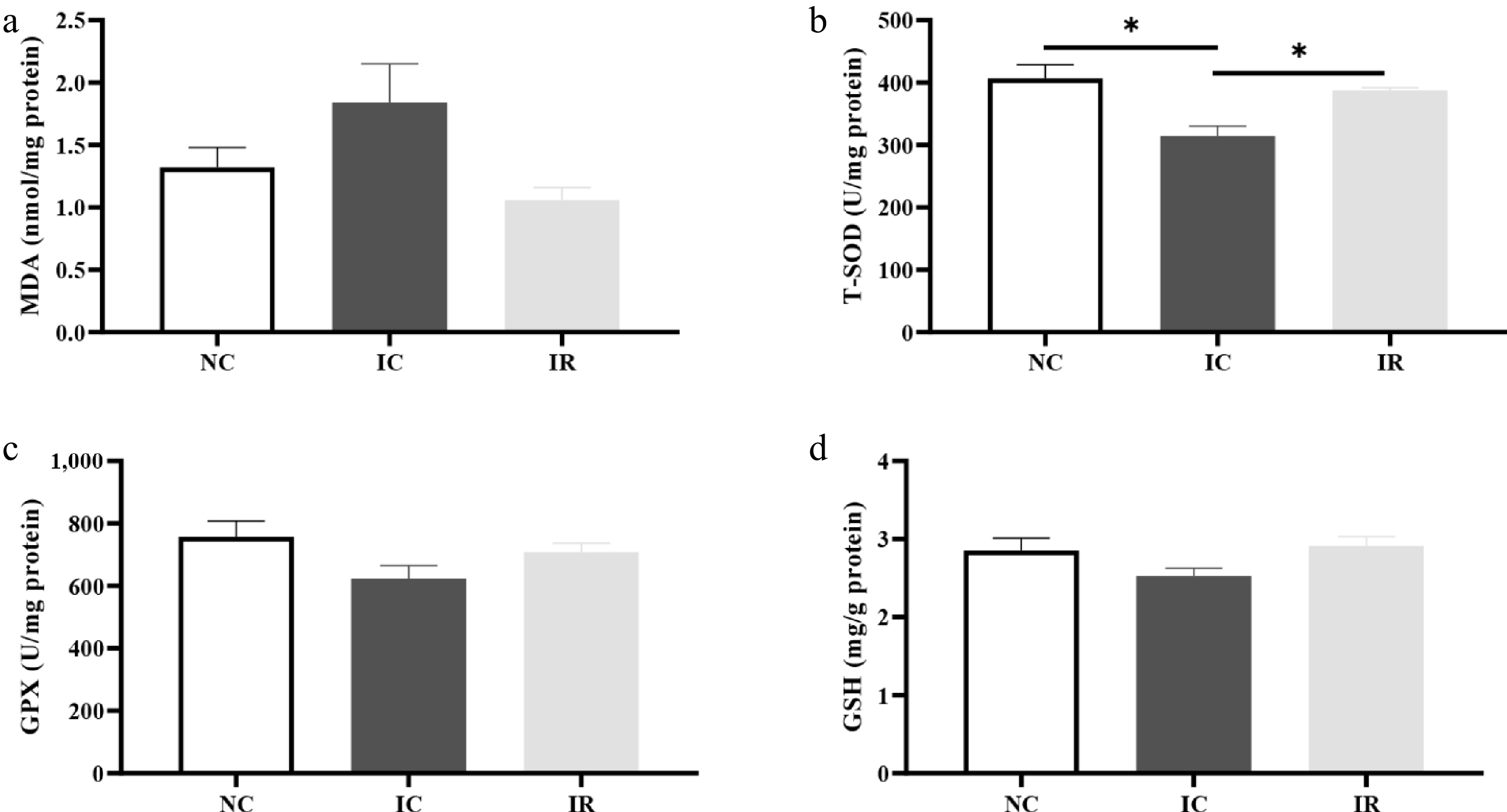 Resveratrol improves hepatic redox status in weaned piglets with intrauterine growth retardation. (a) MDA, malondialdehyde. (b) T-SOD, total superoxide dismutase. (c) GPX, glutathione peroxidase. (d) GSH, reduced form of glutathione. NC, piglets with normal birth weight fed a basal diet; IC, piglets with intrauterine growth retardation fed a basal diet; IR, piglets with intrauterine growth retardation fed a basal diet supplemented with 300 mg/kg RSV. Results are presented as means and standard errors. * p < 0.05.