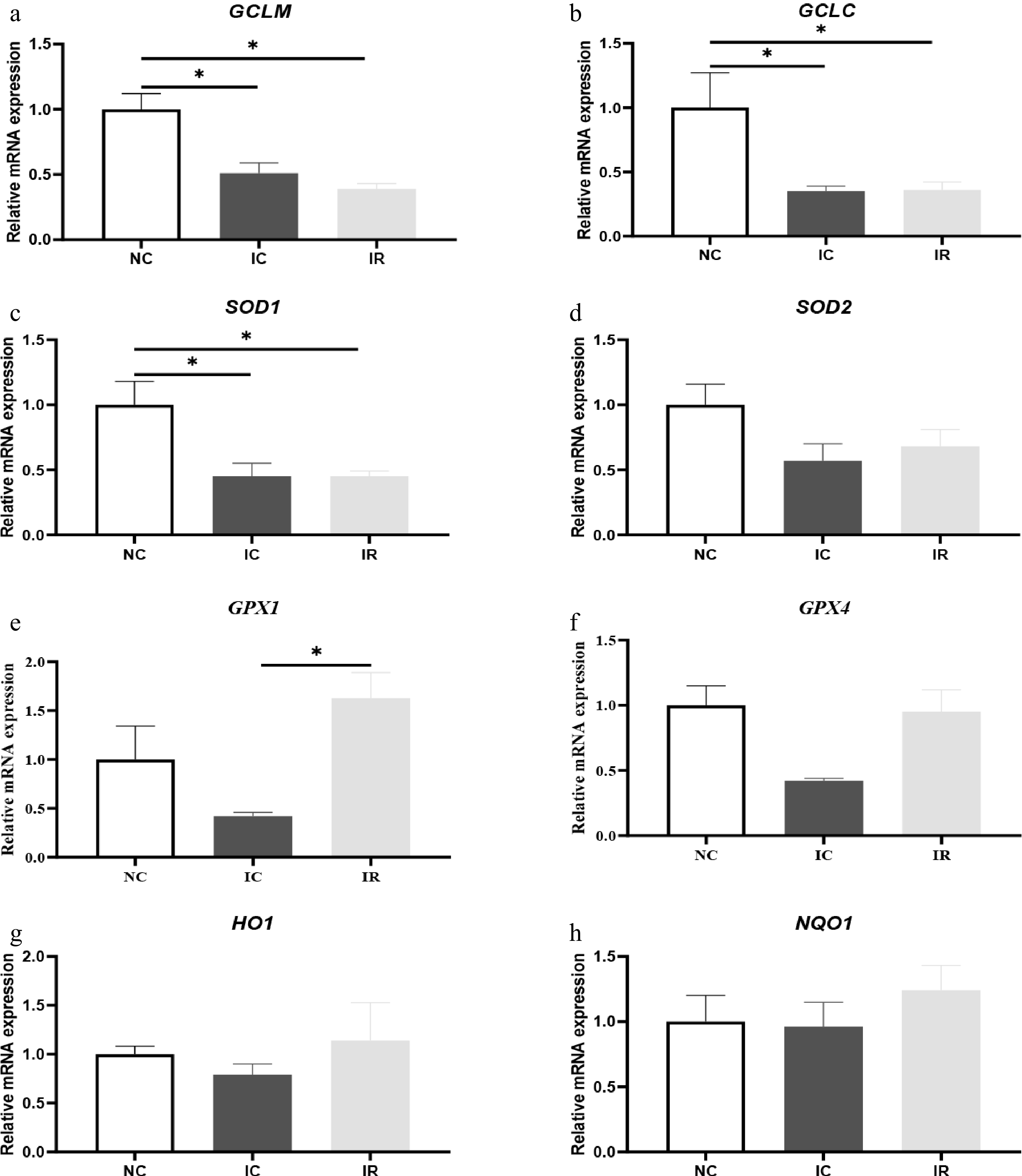 Resveratrol affects hepatic antioxidant function-related gene expression in weaned piglets with intrauterine growth retardation. (a) GCLM, glutamate-cysteine ligase modifier subunit. (b) GCLC, glutamate-cysteine ligase catalytic subunit. (c) SOD1, superoxide dismutase 1. (d) SOD2, superoxide dismutase 2. (e) GPX1, glutathione peroxidase 1. (f) GPX4, glutathione peroxidase 4. (g) HO1, heme oxygenase 1. (h) NQO1, NAD (P) H: quinone oxoreductase 1. NC, piglets with normal birth weight fed a basal diet; IC, piglets with intrauterine growth retardation fed a basal diet; IR, piglets with intrauterine growth retardation fed a basal diet supplemented with 300 mg/kg RSV. Results are presented as means and standard errors. * p < 0.05.