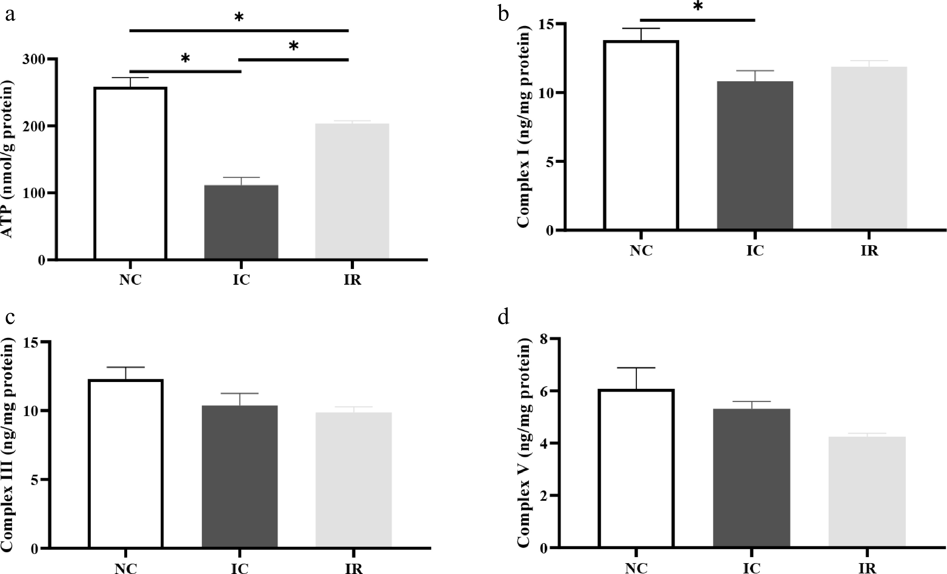 Resveratrol enhances hepatic energy production in weaned piglets with intrauterine growth retardation. (a) ATP, adenosine triphosphate. (b) Complex I. (c) Complex III. (d) Complex V. NC, piglets with normal birth weight fed a basal diet; IC, piglets with intrauterine growth retardation fed a basal diet; IR, piglets with intrauterine growth retardation fed a basal diet supplemented with 300 mg/kg RSV. Results are presented as means and standard errors. * p < 0.05.
