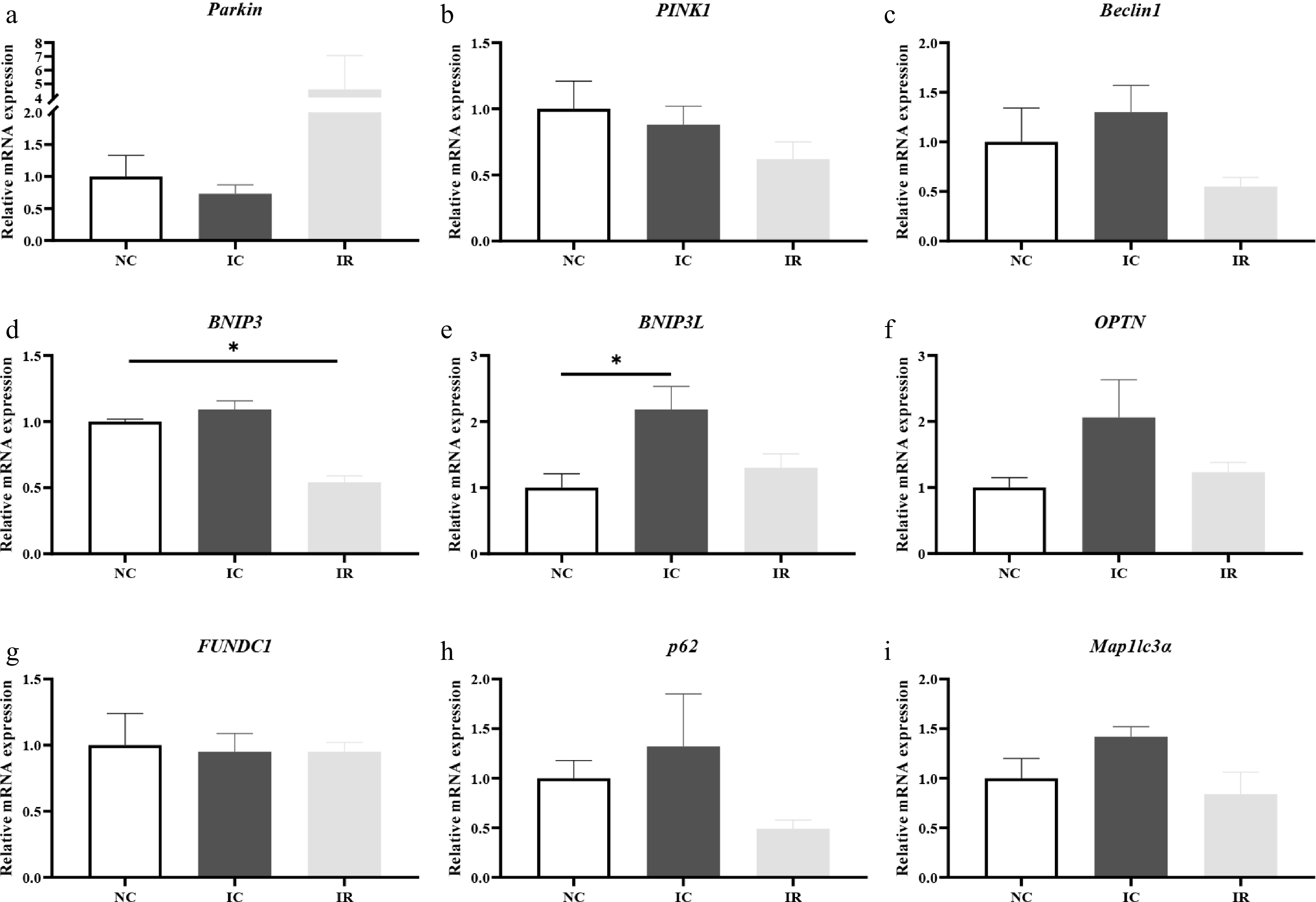 Resveratrol regulates hepatic mitophagy-related gene expression in weaned piglets with intrauterine growth retardation. (a) Parkin. (b) PINK1, PTEN-induced putative kinase 1. (c) Beclin1. (d) BNIP3, BCL2/adenovirus E1B 19 kDa protein-interacting protein 3. (e) BNIP3L, BCL2/adenovirus E1B 19-kDa-interacting protein 3-like. (f) OPTN, optineurin. (g) FUNDC1, FUN14 domain-containing 1. (h) p62. (i) Map1lc3α, microtubule-associated protein 1 light chain 3 alpha. NC, piglets with normal birth weight fed a basal diet; IC, piglets with intrauterine growth retardation fed a basal diet; IR, piglets with intrauterine growth retardation fed a basal diet supplemented with 300 mg/kg RSV. Results are presented as means and standard errors. * p < 0.05.