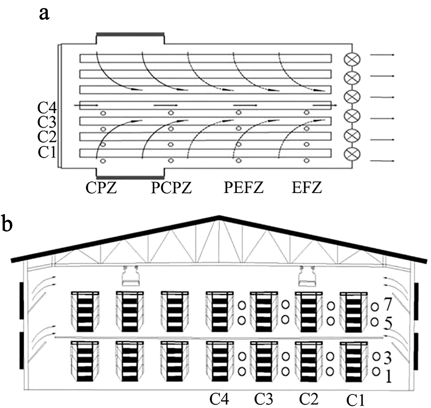 Spatial layout of measurement locations. (a) Cages numbered 22 to 24 were assigned to the cooling pad zone (CPZ); Cages 67 to 69 represented the proximal cooling pad zone (PCPZ). Similarly, Cages 112 to 114 corresponded to the proximal exhaust fan zone (PEFZ), and Cages 157 to 159 were categorized as being in the exhaust fan zone (EFZ). (b) Vertically, tiers were denoted by the numerals 1, 3, 5, and 7, indicating the first, third, fifth, and seventh levels. The column positions were marked as C1–C4, where C1 refers to the column closest to the henhouse wall.