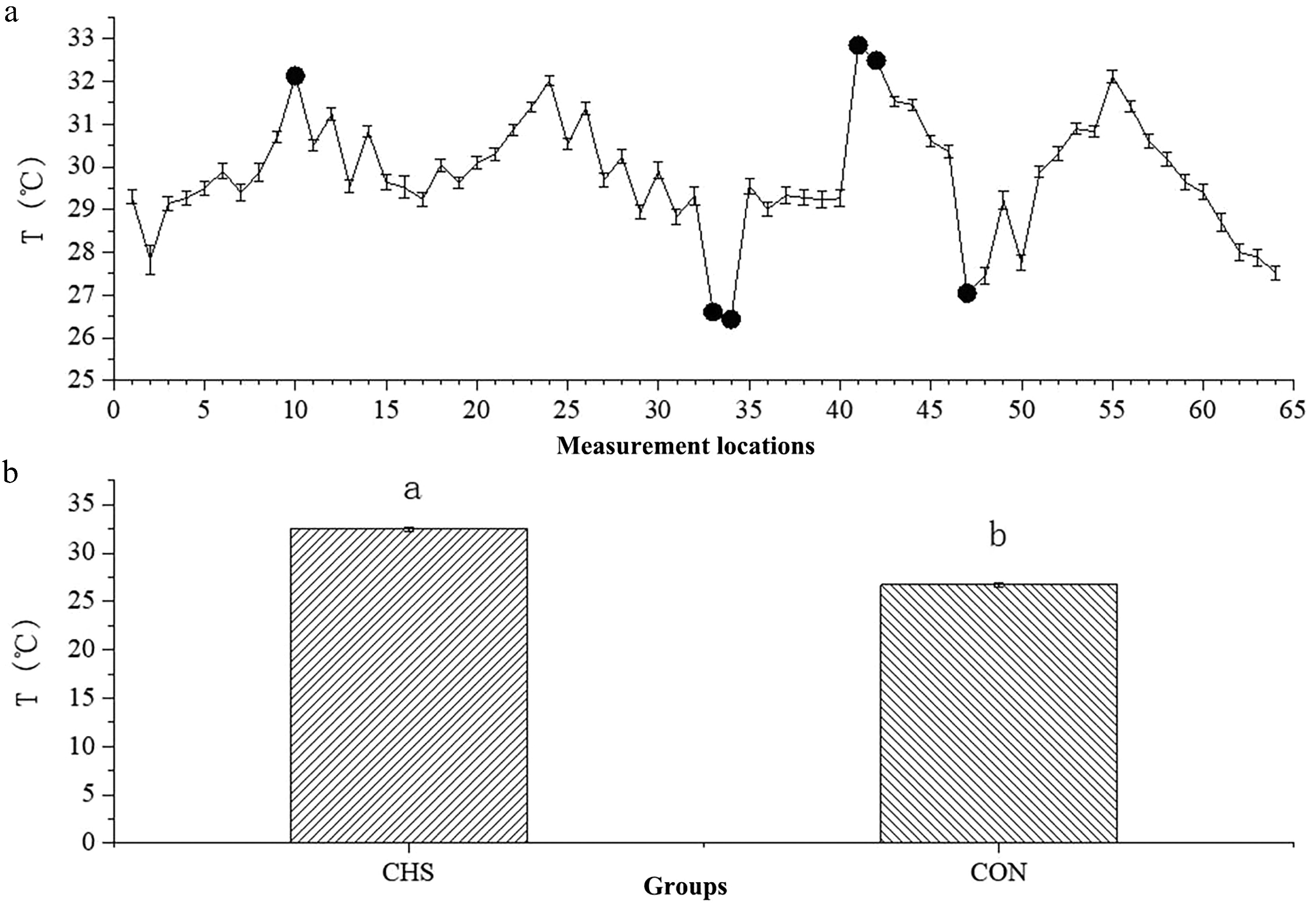 Average temperatures at different measurement locations (a) and between the CHS and CON groups (b). (a) The x-axis denotes the sequential order of the 64 sampling locations, whereas the y-axis depicts the temperature measurements obtained at each location. Highlighted points indicate sites selected for further investigation. (b) A comparison of the average temperatures between the CHS and CON groups. Abbreviations: CHS, chronic heat stress group; CON, control group.