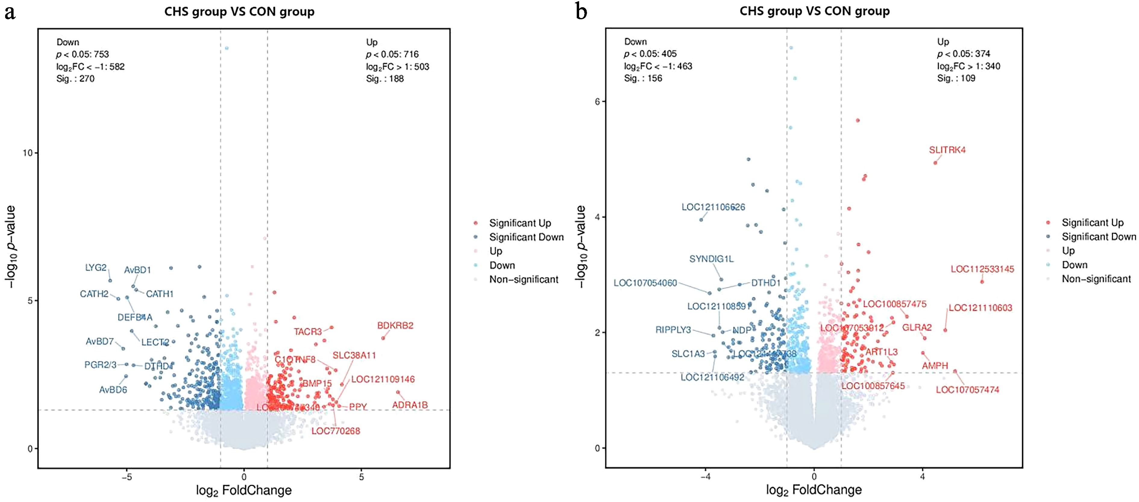 • Compared with the CON group, transcriptomic analysis identified 458 DEGs in the pituitary tissue, comprising 188 upregulated and 270 downregulated genes in the CHS group. In the liver, 267 DEGs were detected, including 109 upregulated and 156 downregulated genes under CHS conditions (Fig. 3).