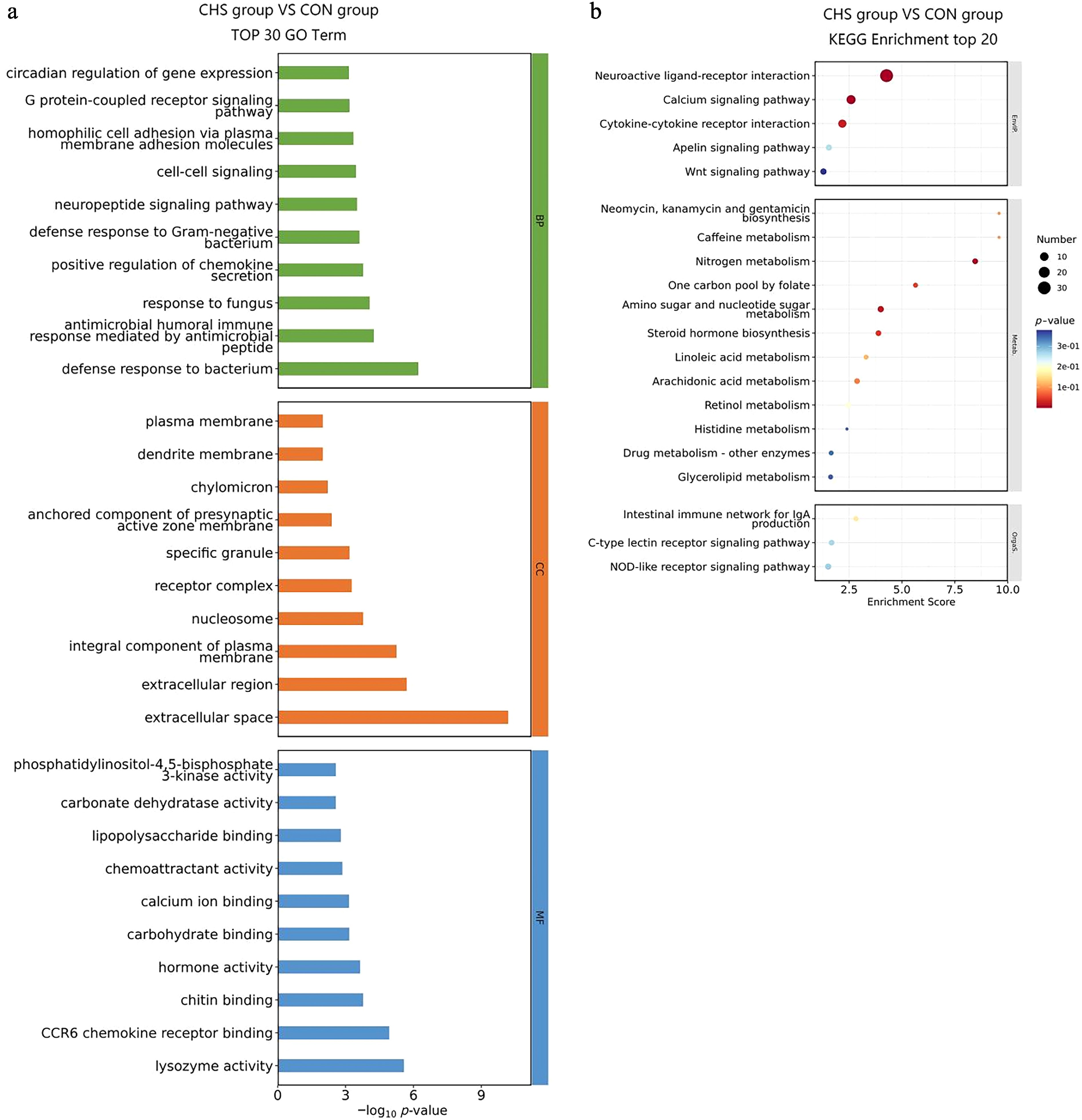 • To clarify the biological significance of DEGs in pituitary tissue, GO and KEGG enrichment analyses were performed (Fig. 4, Supplementary Tables S2, S3). Among the "biological process" (BP) terms, the five most significantly enriched categories included defense response to bacterium, antimicrobial humoral immune response mediated by antimicrobial peptides, response to fungus, positive regulation of chemokine secretion, and defense response to Gram-negative bacterium (Fig. 4a). With regard to the "cellular component" (CC) classification, DEGs were mainly distributed in the extracellular space, extracellular region, integral components of the plasma membrane, nucleosomes, and receptor complexes. In the "molecular function" (MF) domain, DEGs exhibited significant enrichment in lysozyme activity, CCR6 chemokine receptor binding, chitin binding, hormone activity, and carbohydrate binding (Fig. 4a). Moreover, KEGG pathway analysis revealed notable enrichment in neuroactive ligand–receptor interaction, calcium signaling pathway, nitrogen metabolism, amino sugar and nucleotide sugar metabolism, cytokine–cytokine receptor interaction, steroid hormone biosynthesis, and the one-carbon pool by folate pathway (Fig. 4b).