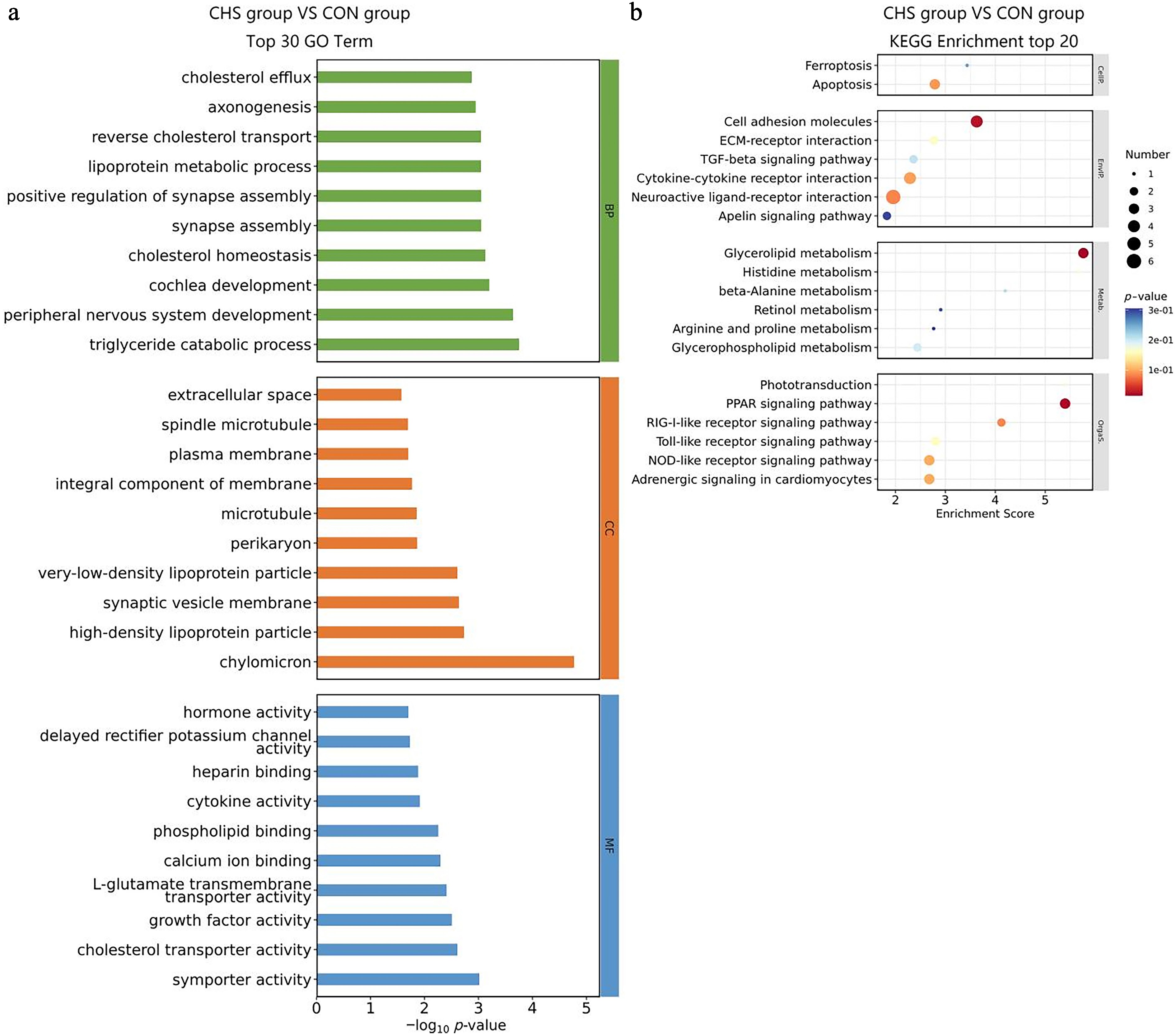 Similarly, among the BP terms, the five most significantly enriched categories identified in the liver tissue were triglyceride catabolic process, peripheral nervous system development, cochlea development, cholesterol homeostasis, andsynapse assembly (Fig. 5a). With regard to the CC classification, DEGs were mainly for the chylomicron, high-density lipoprotein particle, synaptic vesicle membrane, very-low-density lipoprotein particle, and perikaryon (Fig. 5a). In the MF domain, DEGs exhibited significant enrichment in symporter activity, cholesterol transporter activity, growth factor activity, L-glutamate transmembrane transporter activity, and calcium ion binding (Fig. 5a, Supplementary Table S4). KEGG pathway analysis demonstrated notable enrichment in the glycerolipid metabolism, peroxisome proliferator-activated receptors (PPAR) signaling pathway, and cell adhesion molecules (Fig. 5b, Supplementary Table S5).